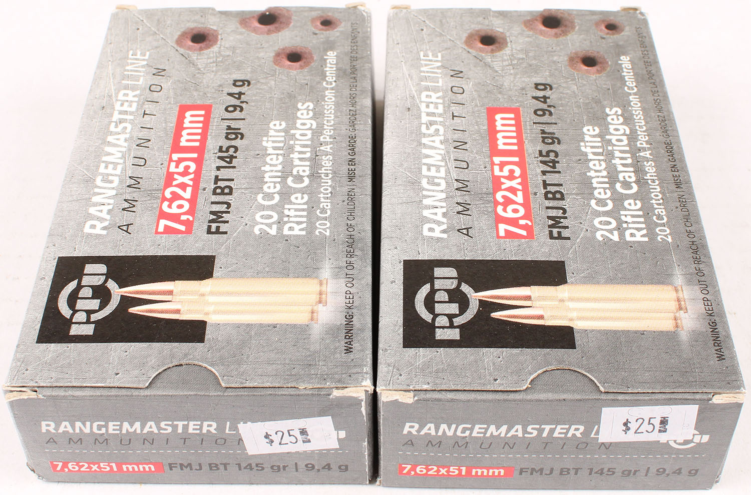 Lot of 2 PPU, 7.62 x 51mm, 145 Grs., Full, 1pc. Multi-colored box, box is solid, with excellent color, Ammo is excellent. Grade: Excellent - Value: 20 to 80
