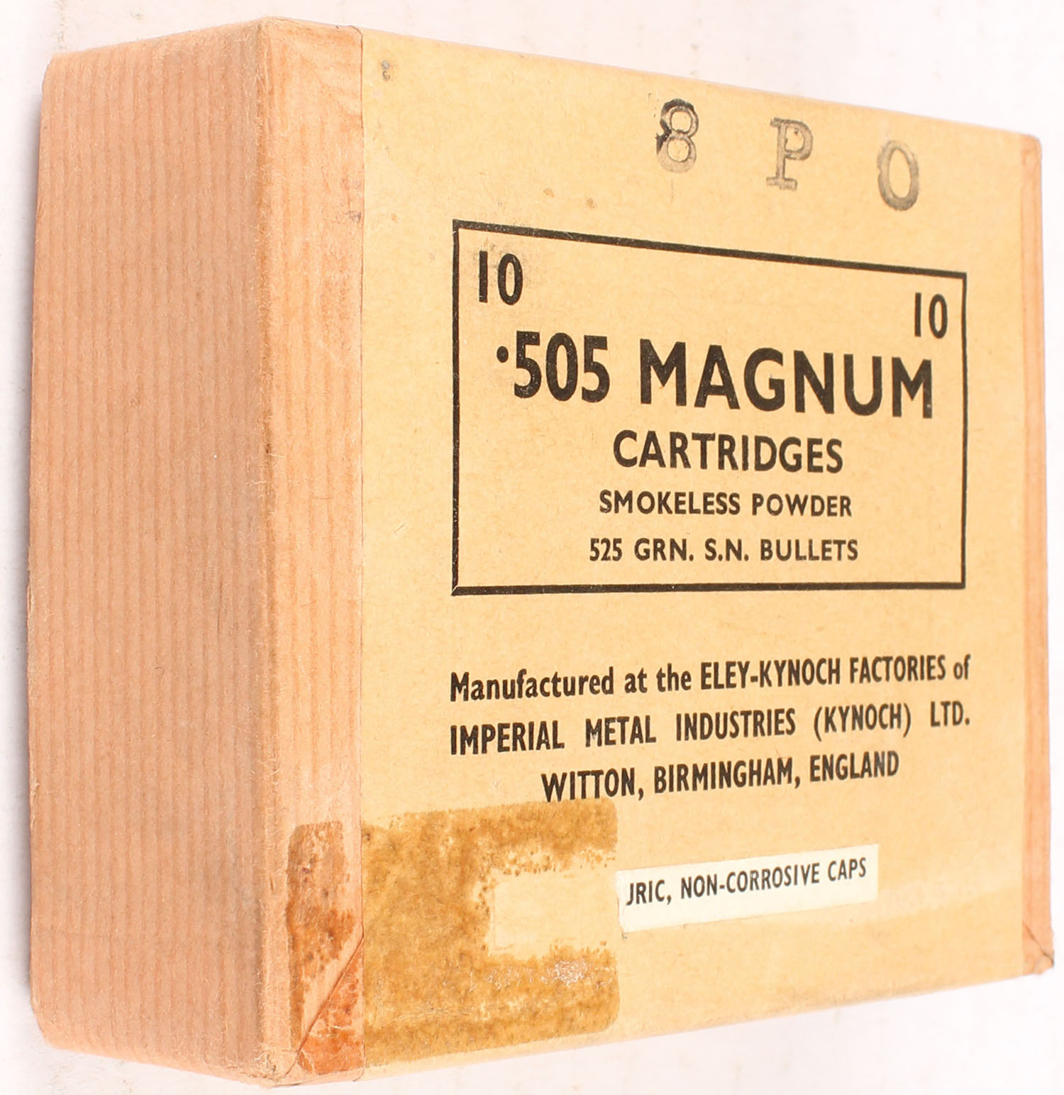 Eley-Kynoch, .505 Magnum , 525 Gr. Bullet, 2pc, Empty, has fired empties, buff box with yellow label & black print, box is solid with light rub marks & light age soiling, ammo is very good. Grade: Excellent - Value: 10 to 100