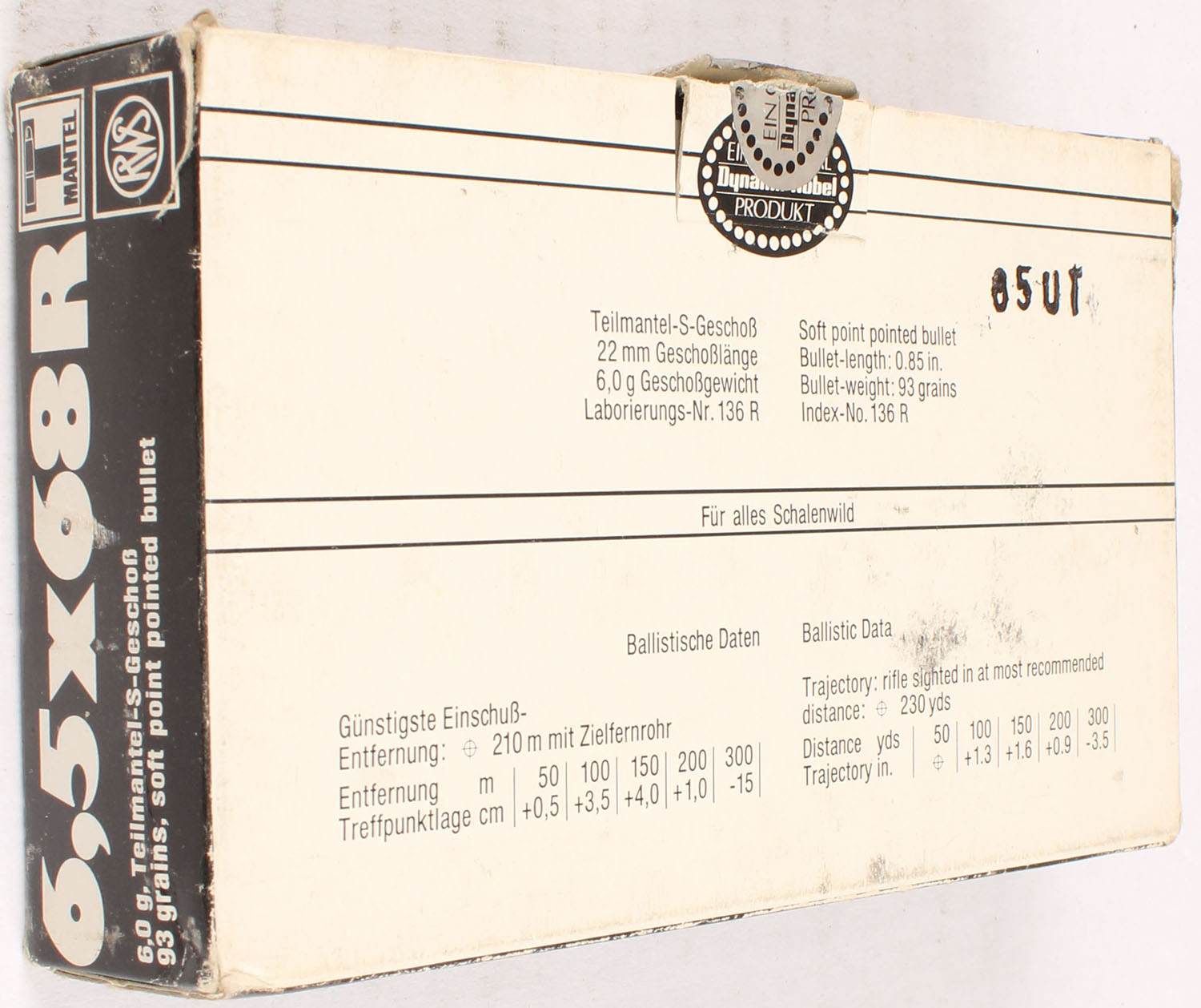 RWS, 6.5 x 68R, Full, 1pc. Multi-colored box, box has age soiling, Ammo is excellent. Grade: Excellent - Value: 16 to 60