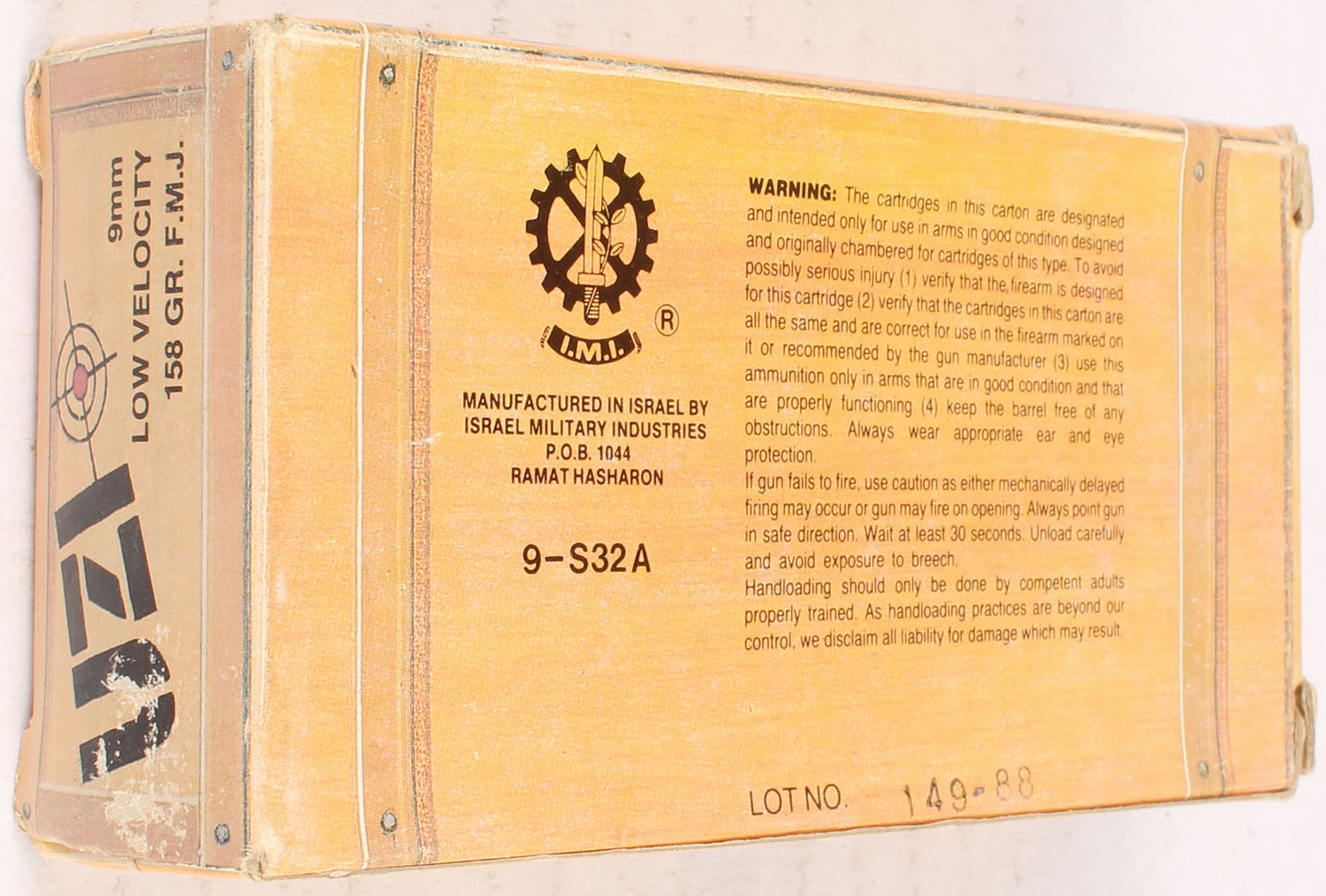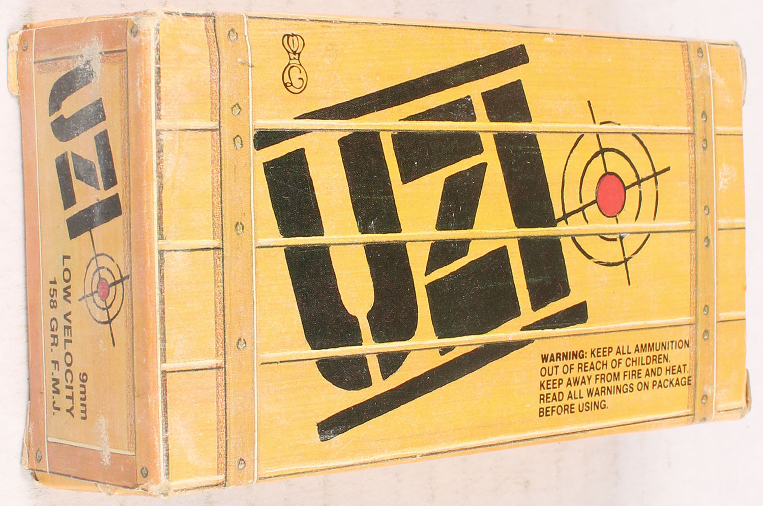 UZI 9mm, Full, 1pc. Multi-colored box, box is solid, with excellent color, Ammo is excellent. Grade: Excellent - Value: 10 to 50