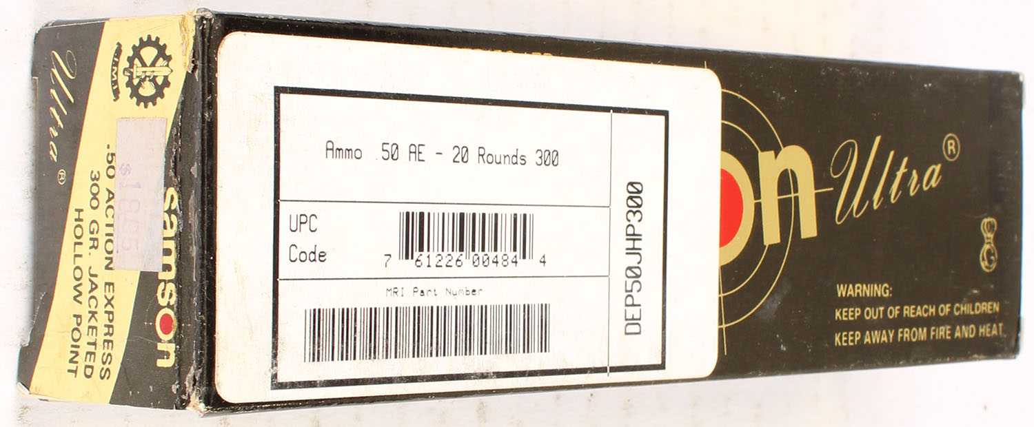 Samson Ultra, .50 AE, 300 Grain JHP, Full, 1pc., Multi-colored box, box is solid with great color, ammo is excellent. Grade: Excellent ++ - Value: 20 to 60