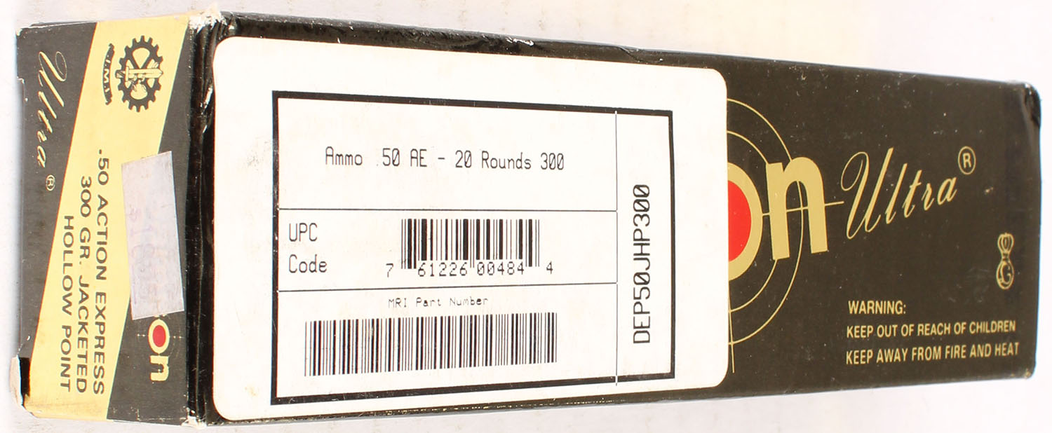 Samson Ultra, .50 AE, 300 Grain JHP, Full, 1pc., Multi-colored box, box is solid with great color, ammo is excellent. Grade: Excellent ++ - Value: 20 to 60