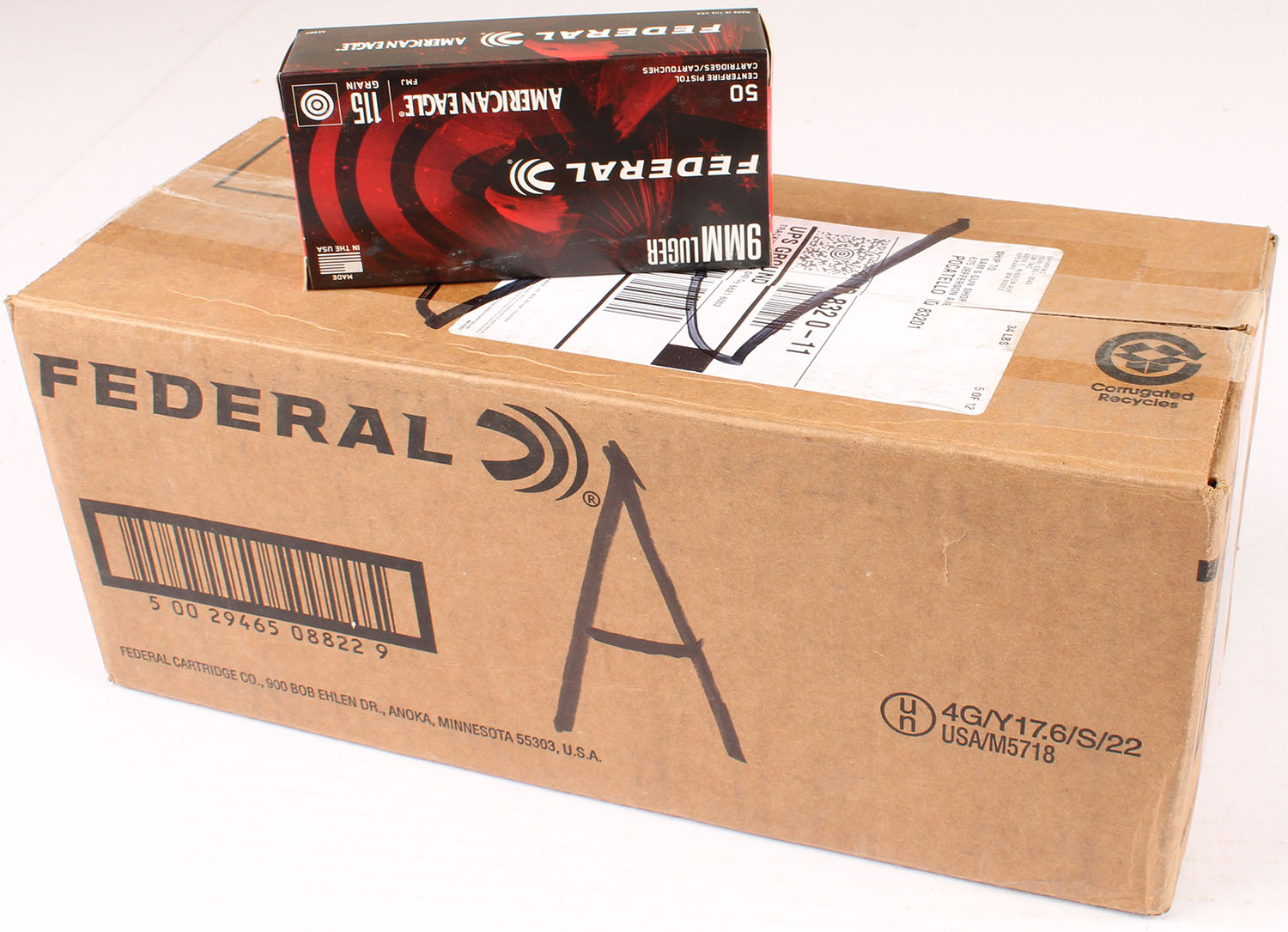 Federal, American Eagle, 9mm Luger, 115 Grain Full Metal Jacket, Full 1,000rds. Case, case is solid, inside boxes are mint. Grade: MINT - Value: 200 to 400