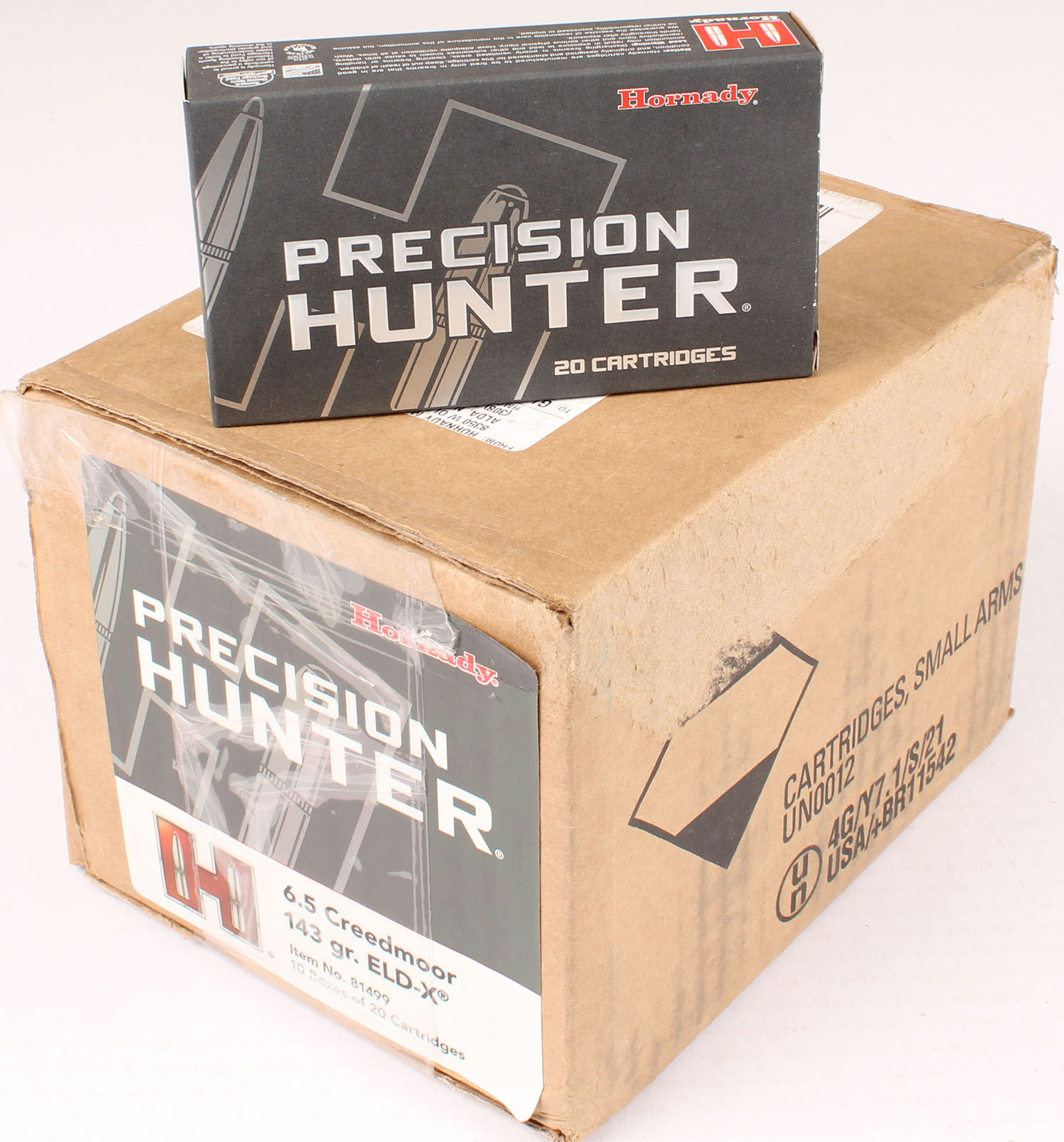Hornady, Precision Hunter, 6.5 Creedmoor 143 Grain ELD-X, Full, 200rds. Case, case is solid, inside boxes are mint. Grade: MINT - Value: 300 to 500