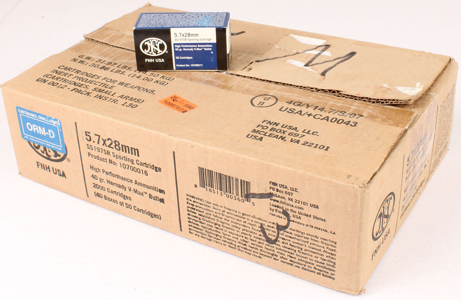 FN, 5.7 x 28mm, 40 Grain Hornady V-Max, Full 2000rds. Case, case is solid, inside boxes are mint. Grade: MINT - Value: 1000 to 2000