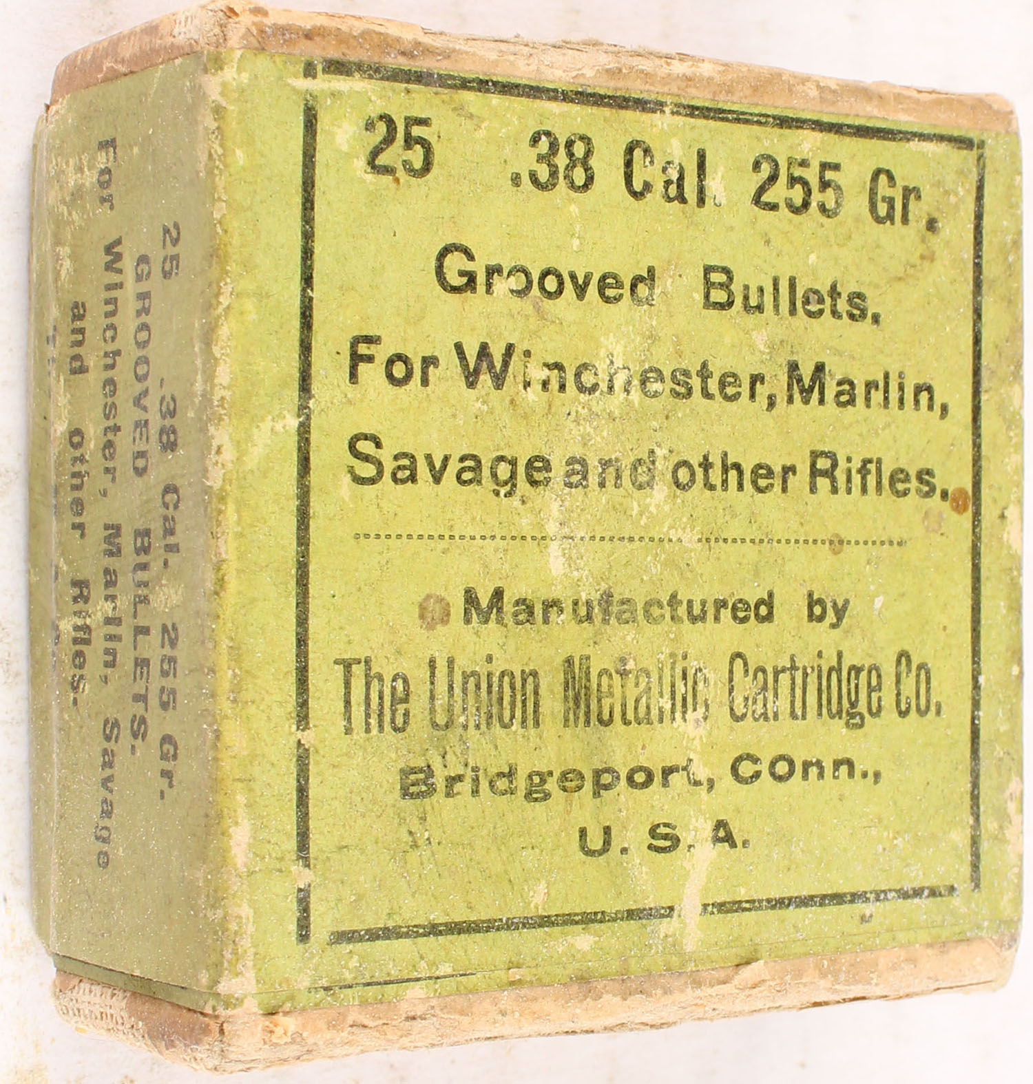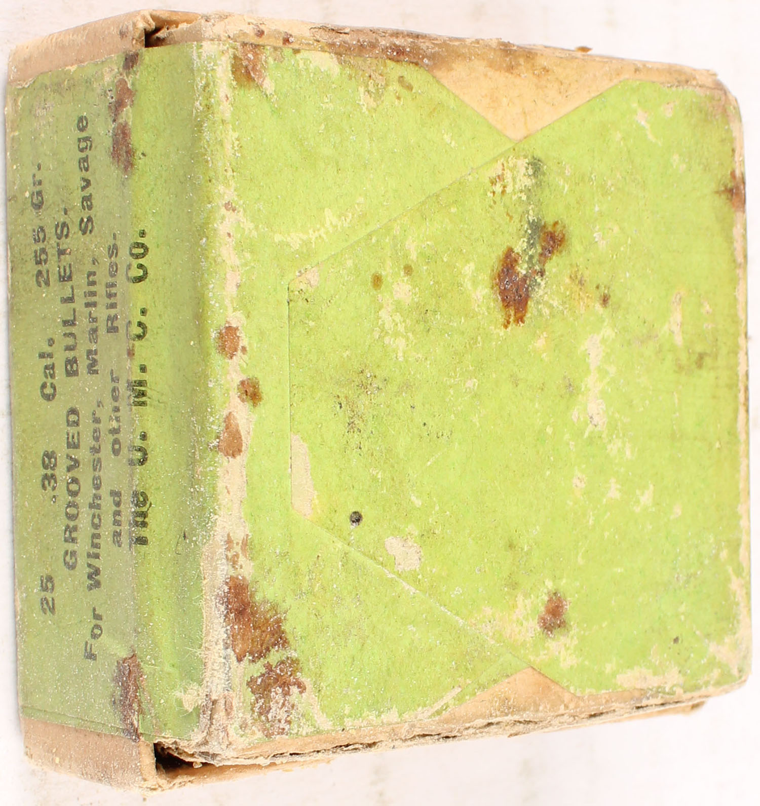 UMC, .38 Cal. 255 Grain Grooved Bullets, FULL & SEALED, 2pc. Buff box with green wraparound label, box is solid with very good color, minor age soiling & color fading, some shelf wear, edge & corner wear, label is intact. Grade: Very Good - Value: 10 to 40