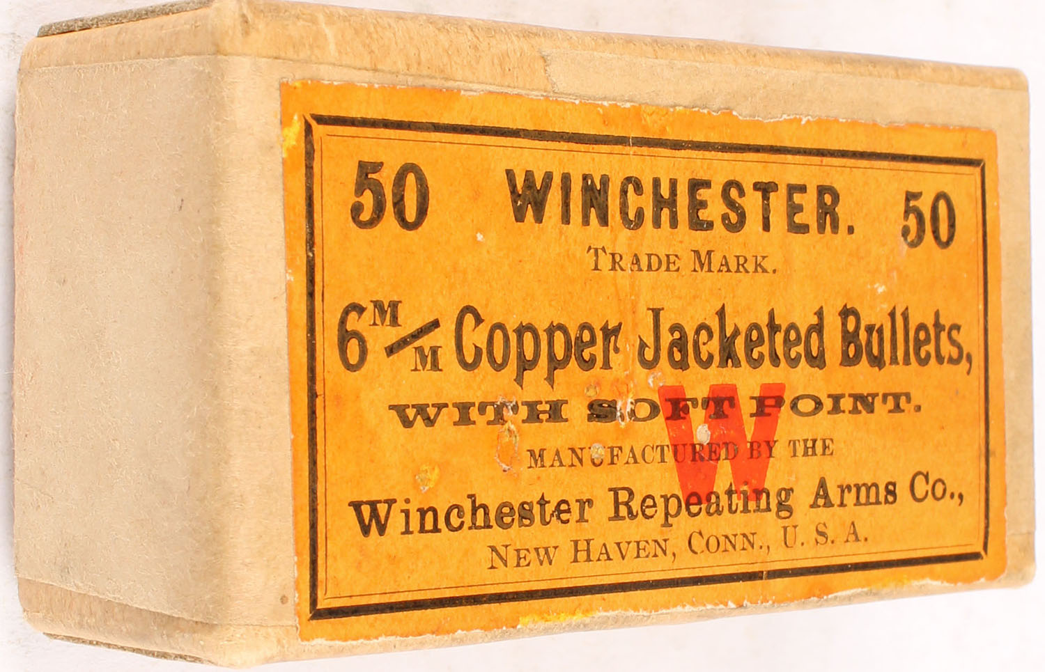 Winchester, 6mm, Copper Jacketed Bullets With Soft Point, Partial 49rds., 2pc. Buff box with orange label, box is solid with very good to excellent color, minor age soiling & corner wear, edges are mostly crisp, label is intact, bullets are excellent. Grade: Excellent - Value: 10 to 40