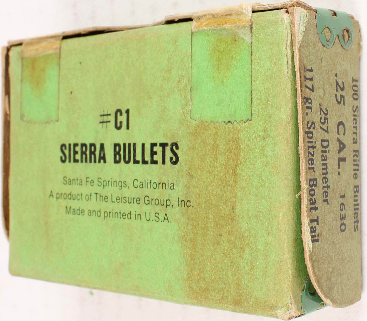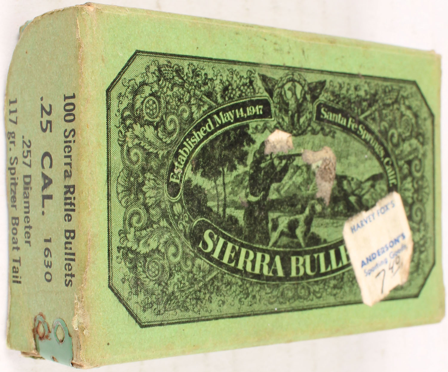 Sierra, .25 Cal., 117 Grain Spitzer Boat Tail, Partial, appears 3/4 Full, 1pc. Green & black box, box is solid with very good to excellent color, some age soiling & shelf wear, minor edge & corner wear, tape on box, top flap is solid, bullets are minty. Grade: Very Good ++ - Value: 8 to 40