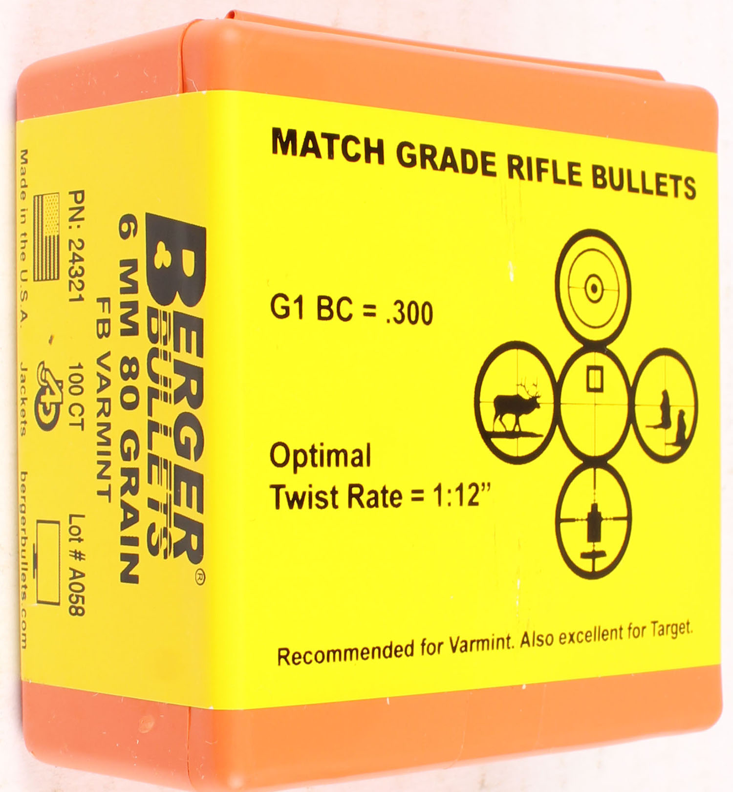 Berger, 6mm, 80 Grain FB Varmint, Match Grade Rifle Bullets, FULL & SEALED, 1pc. Orange plastic box with yellow wraparound label, box is MINT, label is intact. Grade: MINT - Value: 10 to 40