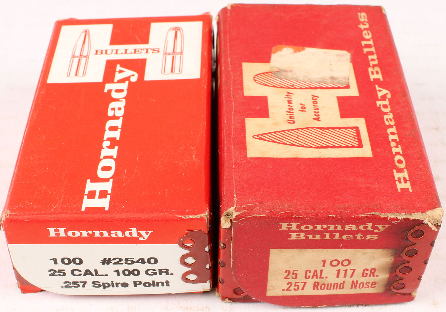 Hornady, Lot of (2) .25 Cal, (1) 100 Grain .257 Spire Point, (1) 117 Grain .257 Round Nose, spire point box FULL & SEALED, Round Nose box Full, both boxes solid, one box MINT, one box very good, bullets in open box are minty. Grade: Excellent - Value: 20 to 60