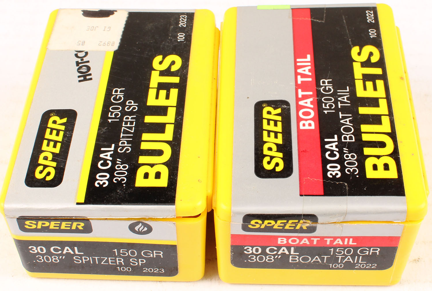 Speer, Lot of (2), .30 Cal., (1) box 150 Grain .308 Spitzer Soft Point, (1) box 150 Grain .308 Boat Tail, both boxes are full, 2pc. Yellow plastic boxes with multi-colored sealing labels, boxes are solid with excellent color, very minor shelf wear, bullets are minty. Grade: Excellent + - Value: 20 to 60