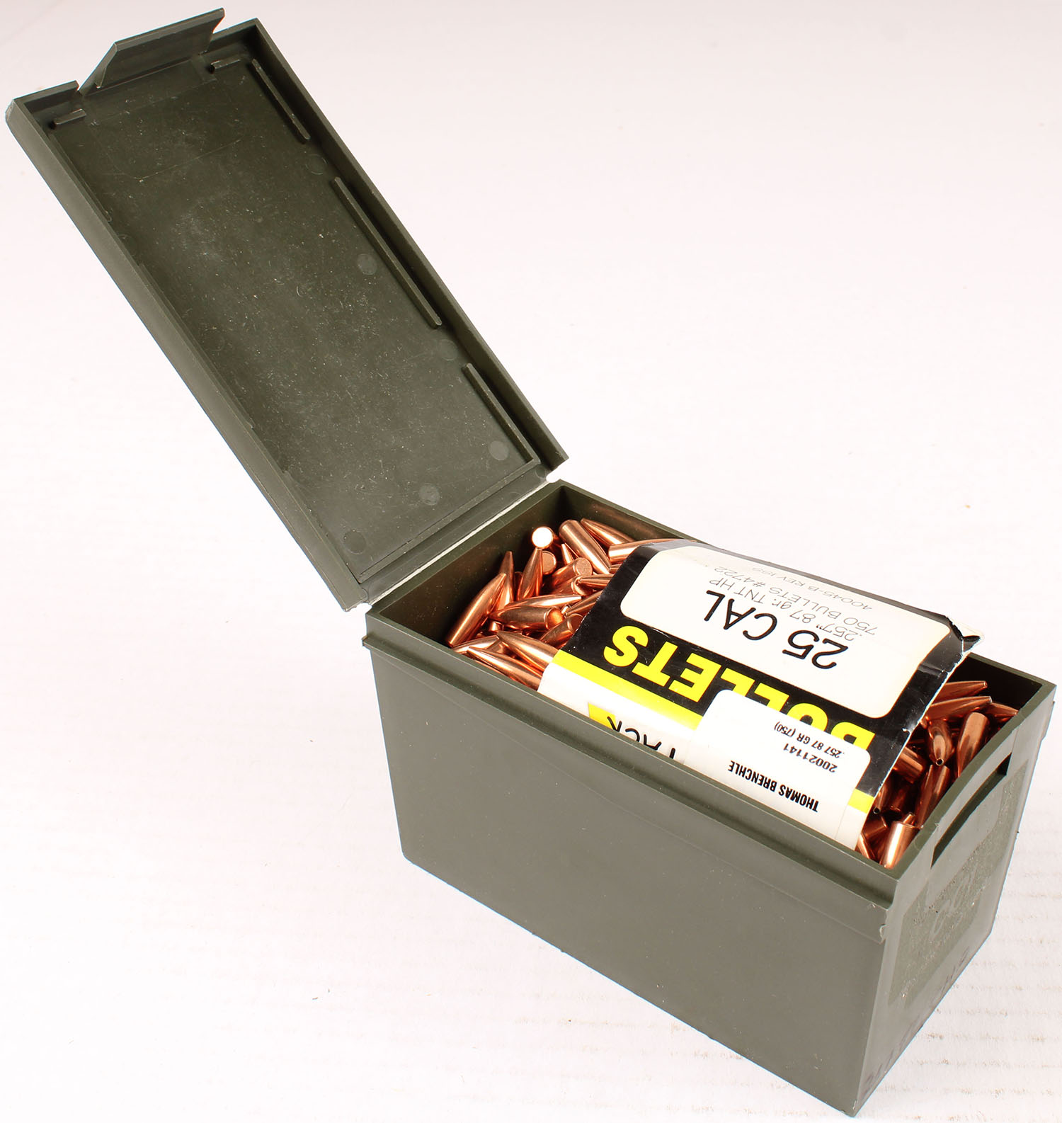 Speer, Value Pack, .25 Cal., 87 Grain TNT Hollow Point, 257 Dia., Full 750rds. Plastic bulk box, box is solid with excellent color, some tape residue, label is in box, bullets are minty. Grade: Excellent - Value: 40 to 200