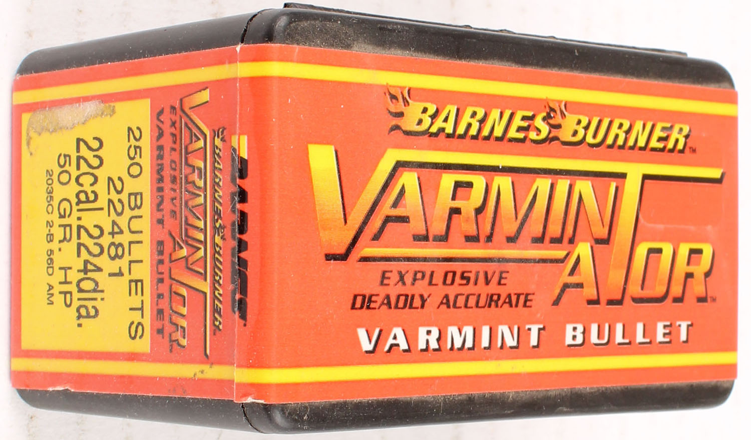 Barnes, Varmintator, .22 Cal., 50 Grain Hollow Point, .224 Dia., Explosive Varmint Bullet, Full, 1pc. Black plastic box with red & yellow sealing label, box is solid with excellent to minty color, label is intact, bullets are mint. Grade: Ecellent ++ - Value: 20 to 60
