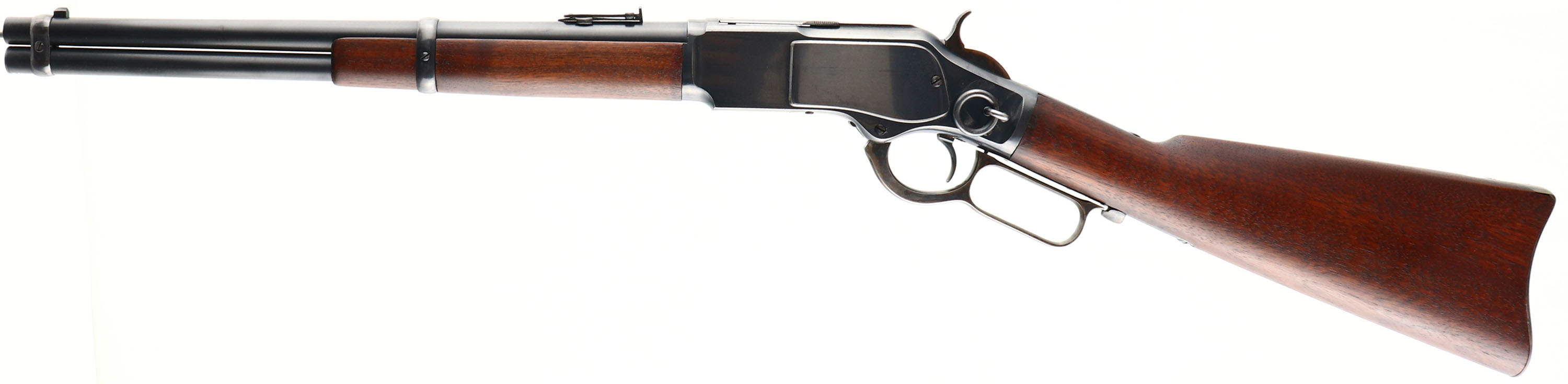 RARE Winchester, Model 1873 16'' Trapper (Baby Carbine) Saddle Ring Carbine, Third model, .44 WCF Cal., MFG: 1890, SN:324028, Lever Action Carbine, 16'' Round barrel, Full mag. This carbine was thoroughly & professionally restored back to factory standards. For most, it would pass as all original. The wood stocks are excellent, with virtually no handling marks. The Trapper 8'' length forend dost have a 2'' stress crack at the tip. Wood remains proud to the metal. The metal blue finish rates 99% overall. The case-hardened lever, buttplate & hammer display strong case-colors. The loading gate & dust cover have the correct oxide blue. Fitted with original 1873 ladder rear sight & box carbine front sight. Bore is excellent. Stock carries a sliding trapdoor carbine metal buttplate. The carbine come with a Cody Winchester lookup sheet, which confirms dates & configuration. This is an overall excellent condition & very rare 1873 SRC trapper, which is very collectible.* NO FFL Req. - Value: 12000 to 20000