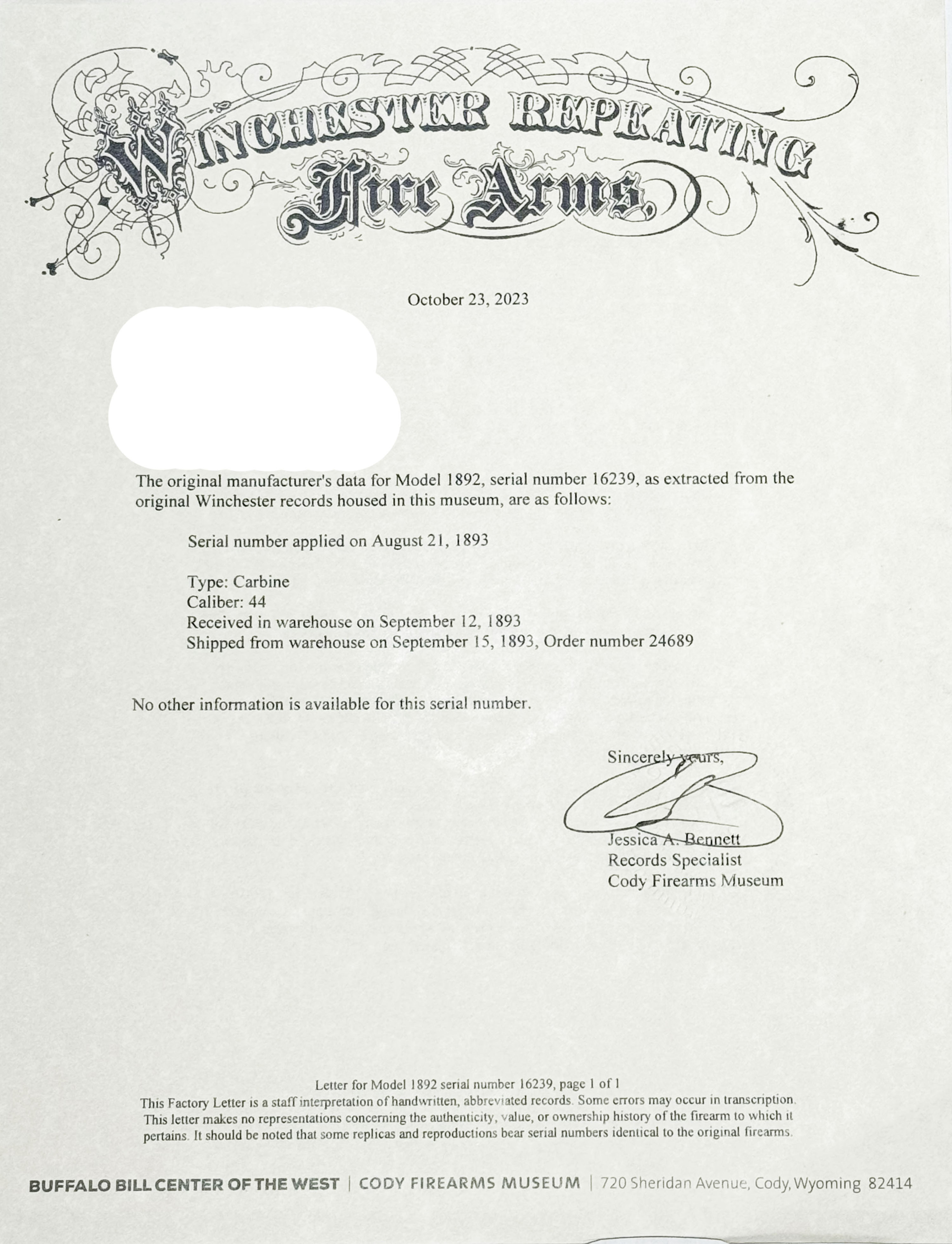 WONDERFUL Winchester, Model 92 SRC, marked 44 WCF, MFG. 1893, SN: 16239, Lever Action Carbine, 20'' Round Barrel, Full mag. Early 2nd year production antique SRC. The replaced buttstock & original forend are excellent & solid. They carry the original finish, with numerous light to small handling blemishes, scuffs or contusions. The left side of the stock carries a 1/4'' rack or inventory number ''016'' along the edge of the buttplate. The barrel & mag carry 90% of original factory blue, toning a bit grayish brown as it thins. The receiver carries 70% original blue, with typical striation loss & wear from the saddle ring rubbing. The case-hardened hammer & lever still display the remains of case-colors. Bore is very good, with some roughness amongst strong rifling. Barrel fitted with a three leaf rear sight & carbine box front sight. Metal carbine buttplate. Original saddle ring. Tight action. Comes with a Cody Winchester Letter confirming configuration & date. A great little carbine in original condition & very desirable in 44 WCF..* NO FFL Req. - Value: 7000 to 12000