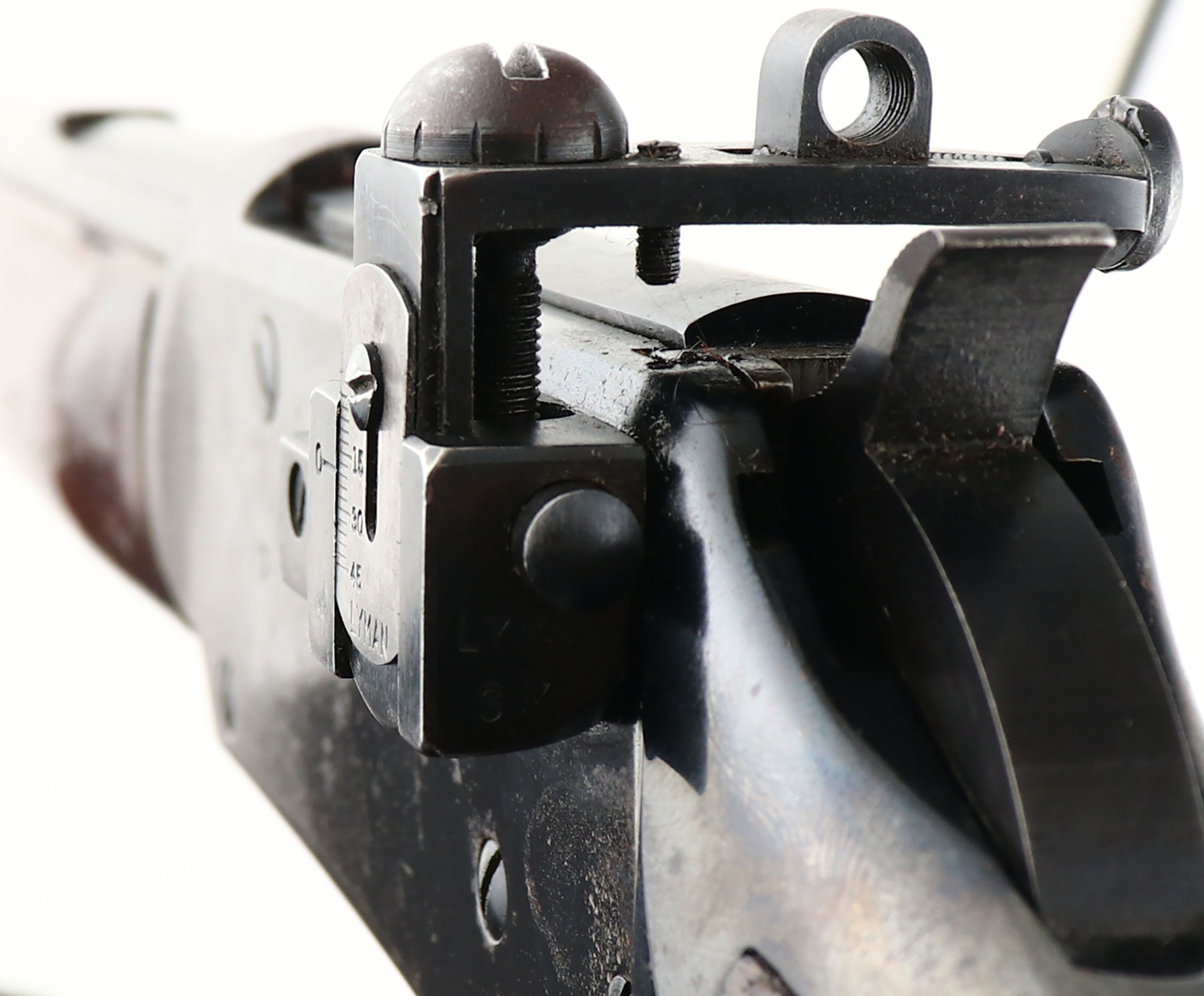 Winchester, Model 64A, marked 30-30 WIN, MFG. 1972-73, SN: 3595315, Lever Action Rifle, 24'' Round barrel, mag holds 7 rounds. This is one of the rarer & fewer made Winchester models produced, with an estimated 12,000 rifles. The 64A was a direct copy of the 1871-1971 M-94 NRA Centennial Rifle commemorative, less the NRA's engraving & medallion, & is a lot like the pre-64 Model 64 in style, but not exact. The model 64 was made from 1933-57 produced only 66,783 total rifles. The original pistol grip wood stocks on this example are very good & solid, although the original finish shows lots of wear or flaking along with other scuffs, dings & scratches. The original metal blue finish is 90% on barrel & mag, but just 25% on the receiver due to flaking & wear loss. Bore is excellent. The rifle carries an adjustable Lyman receiver peep sight, a blank filled rear dovetail & a front ramp sight, missing the hood. Stock carries a checkered Winchester plastic buttplate. Factory sling provisions. A fairly rare low production rifle & popular in the 30-30 as a deer rifle. FFL or C&R Req. - Value: 600 to 1000