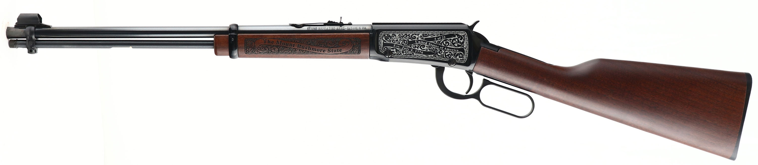 BOXED, Henry Repeating Arms Co, Model H001 Historical Armory Inc Custer County South Dakota, CAL: 22LR, MFG: Modern, SN: 957863H, Lever Action Rifle, 18 1/2'' barrel. The custom engraved straight grip wood stocks are excellent. The right side of the stock displays original artwork, & finely detailed engraving to celebrate the history of Custer County. The right side of the forend is marked ''CUSTER COUNTY EST.1875 SOUTH DAKOTA'' encompassed by decorative floral scroll. The left side of the forend is marked ''THE MOUNT RUSHMORE STATE'', also with decorative floral scroll. The left side of the receiver is marked ''5 OF 25 UNITED STATES OF AMERICA EST JULY 4TH 1776'' & the right side of the receiver is marked ''THE 40TH STATE OF SOUTH DAKOTA EST NOV 2, 1889''. The straight grip wood stock is excellent. The metal blue finish rates 99% overall. Bore is excellent. The barrel holds an adjustable rear sight & hooded post front sight. Stock has Henry checkered plastic buttplate. Comes in original box, with related paperwork. Box condition is good, with overall wear. There were only 25 Custer County South Dakota rifle sets ever produced by Historical Armory. FFL Req. - Value: 600 to 800