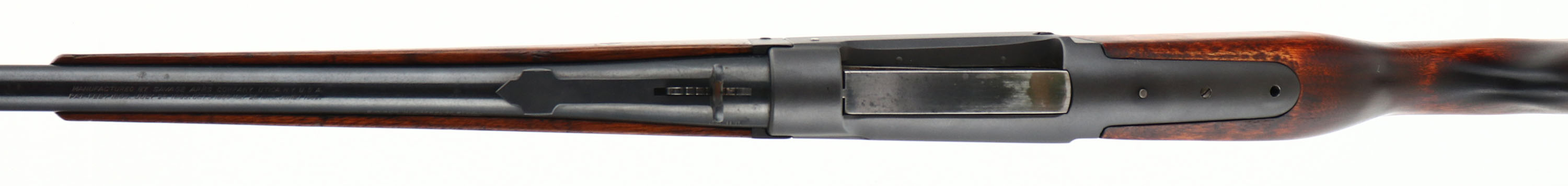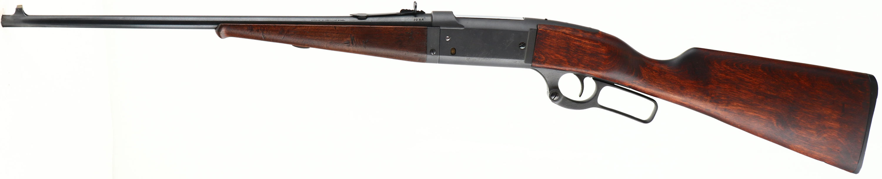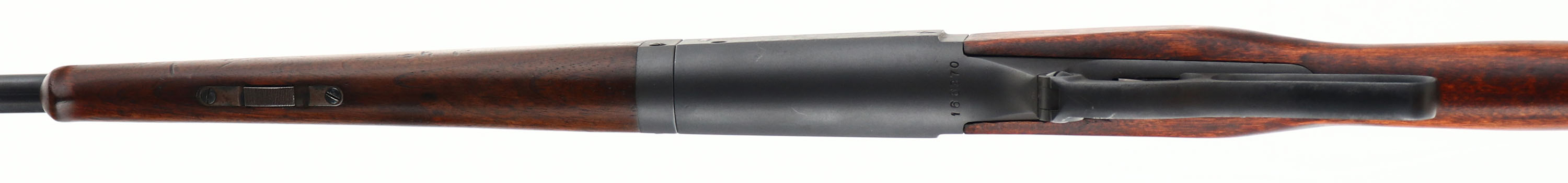Savage Model 1899 Take-down, CAL: 22 H.P., MFG: 1915, SN: 166370, Lever Action Rifle, 20'' SAVAGE HI-PRESSURE STEEL tapered round barrel. The replaced stock is excellent, with a darker hand oiled finish & almost no handling marks. There is two 1/2'' cracks at the toe & an open hole from a previous sling stud. The original forend is very good & solid, but does show numerous small dings & scrapes. The refinished flat metal gray finish on the receiver rates 90%, but with lots of rust pit speckling under the finish, especially on the left side of the receiver & lever. The barrel finish appears original retaining 90% coverage, but with lots of cleaned speckled pitting on the underside last 3'' at muzzle end. Bore rates good, with some roughness amongst proud rifling. The barrel holds an adjustable rear elevator & ramp/blade front sight. Buttstock carries a replaced plastic buttplate with bullseye logo. Missing back screw on upper tang. FFL or C&R Req. - Value: 300 to 600