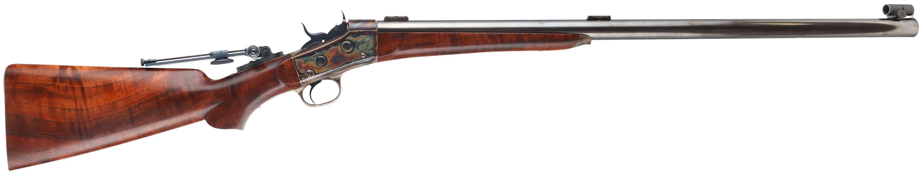 CUSTOM Remington Rolling Block Rifle, 44-70 Maynard Cal., MFG Antique, SN: 7666, 30'' Badger round heavy bull barrel. The metal blued finish barrel is starting to tone gray, but retains 95% coverage. The breechblock, hammer & trigger are blued. The case-hardened receiver displays vivid & beautiful case-colors. The rifle is mounted with a smooth forearm & stock. Forend carries the standard Creedmoor iron cap. The scalloped pistol grip stock carries an ebony insert in the base of the pistol grip. The stocks are excellent, with fantastic scalloped grain.& excellent finish. The stock caries a case-hardened widow's peak smooth metal buttplate exhibiting excellent case-colors. The upper tang of the receiver carries a long range vernier tang sight with large aperture, while the barrel carries a silhouette front globe sight. Bore is excellent & bright. Serial # is marked on the lower tang, The rifle comes with two high quality Buffalo Arms Co. 44 cal. 44-70 Maynard bullet molds, with a sample lead bullet, 49 rds of unprimed empty brass cases head stamped Bell 45-90, & 86 cast lead bullets in a case marked .446 520 gr. Creedmoor. This is a an overall excellent & sharp looking custom Remington rolling block. Antique No FFL Req. - Value: 1200 to 2500