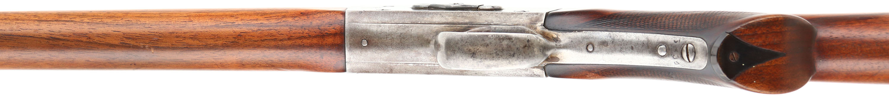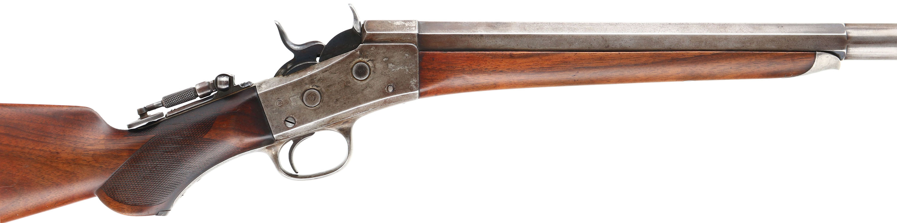 CUSTOM Remington Rolling Block Creedmoor Long Range Target Rifle chambered in 44 S Cal., MFG: 1873-79, SN: 5834, 34 3/8'' Octagon to round barrel. The bottom of the barrel in front of the forend cap is marked ''44 S'', usually this is .44-77 Rem, but could be .44-90. The top of the barrel is marked ''E. REMINGTON & SONS.ILION.N.Y.'' & the serial # is marked on the lower tang, on the underside of the barrel under the forend & on the buttend of the forend. The firearm has a blued 1/3rd octagon to round barrel, which has worn to mostly gun metal gray with a thin brown patina. The breechblock, hammer & trigger are blued. The receiver appears to have been case-hardened, but all the case-colors have faded to gray. The rifle is mounted with a smooth forearm, with the standard Creedmoor iron cap. The scalloped & checkered pistol grip stock carries an ebony insert in the base of the pistol grip. The stocks are excellent & solid, as having been lightly sanded & oiled long ago. All lines of checkering on the pistol grip are fully present, but have smoothed with use. The stocks have a few small handling marks & a couple small spots of fill on the left side of the stock. The stock caries a widow's peak smooth metal buttplate. The upper tang of the receiver carries a tall Lyman tang sight with large aperture, while the barrel carries a flip-up ivory bead front globe sight. Bore is excellent & bright. It is estimated that only 500 of these rifles ere produced. Excellent eye appeal on this highly collectible target rifle. Antique No FFL Req. - Value: 3000 to 6000
