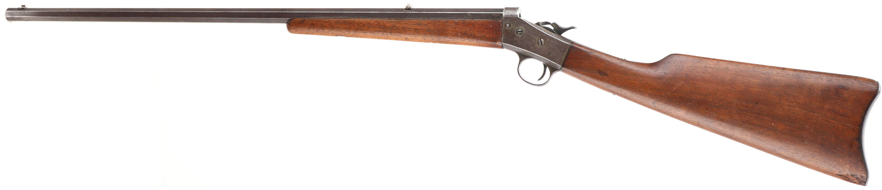 Remington, Model 4 Take-down, .32 SHORT or LONG R.F., MFG 1902-24, SN: 164908, Rolling block single shot rifle. 24'' Octagon barrel. The model 4 was produced from 1890 to 1933 in several variation & evolutions. The model 4 began production in 1890 as a screw in fixed barrel, but it was change to a takedown with lever in 1902 until 24 when it was changed again to a take-down screw. The rifle with the take-down screw was produced from 1924 to 33. The straight grip wood stocks are very good & solid. They carry the original finish with the usual small dings & scratches. There is a 1/2'' by 1 1/2'' missing chip to the left side of the toe. The original metal blue finish has fully toned to an even coverage of brown patina on both barrel & receiver. Bore is poor, with lots of pitting & scarring to the worn rifling. Barrel carries a fixed dovetail rear & standard front sights. The stock carries a smooth metal Remington buttplate. FFL or C&R Req. - Value: 150 to 300