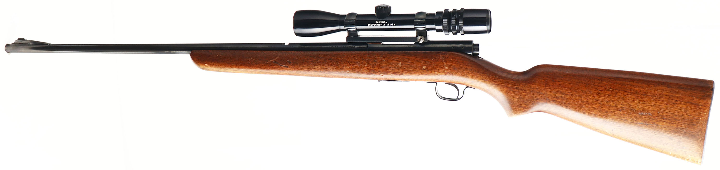Winchester Model 43, CAL: 22 Hornet, Standard First Variation, MFG: 1950, SN:35438A, Bolt Action Rifle, 24'' round barrel. The flat pistol grip wood stock is very good & solid, but with lots of small nicks, scrapes, scratches & contusions to the original finish. The factory metal blue is 90% on the barrel & receiver. Bore is excellent. The rifle is fitted with Bushnell Scopechief IV 2.5x-8x scope, while the barrel has an open rear dovetail & ramp style front sight. Stock missing both sling swivels. Checkered metal buttplate. Original factory detachable mag. A fairly rare rifle as Winchester only made it for six years, with just over 62,500 produced. FFL or C&R Req. - Value: 600 to 1000