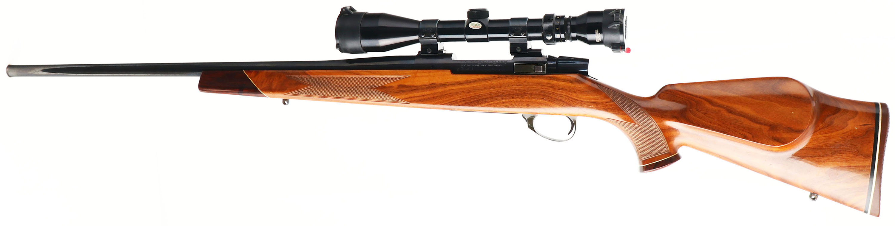 Weatherby, Vanguard, CAL: .243, MFG: 1970-84, SN: V03236, Bolt Action Rifle, 24'' barrel, including the ported muzzle break. This is a Weatherby Vanguard South Gate California receiver, the original Japanese made barrel & the original stock. The original cheeked, checkered & capped pistol grip wood stock is excellent. It features the white liner contrasting rose wood forend tip & grip cap with diamond inlay. There are a number of small scuffs, dings & contusions to the original high gloss finish. The metal blue finish rates 95% overall, with the finish on the receiver toning plum. The finish on the floorplate & trigger guard has toned greenish brown. Bore is excellent. The receiver carries a Tasco 3-9x40 scope, with flip-up caps, & no open sight provisions. Sling studs. Stock carries the original white & black spacer Weatherby solid recoil pad. A quality & original vintage Weatherby. FFL Req. - Value: 700 to 1200