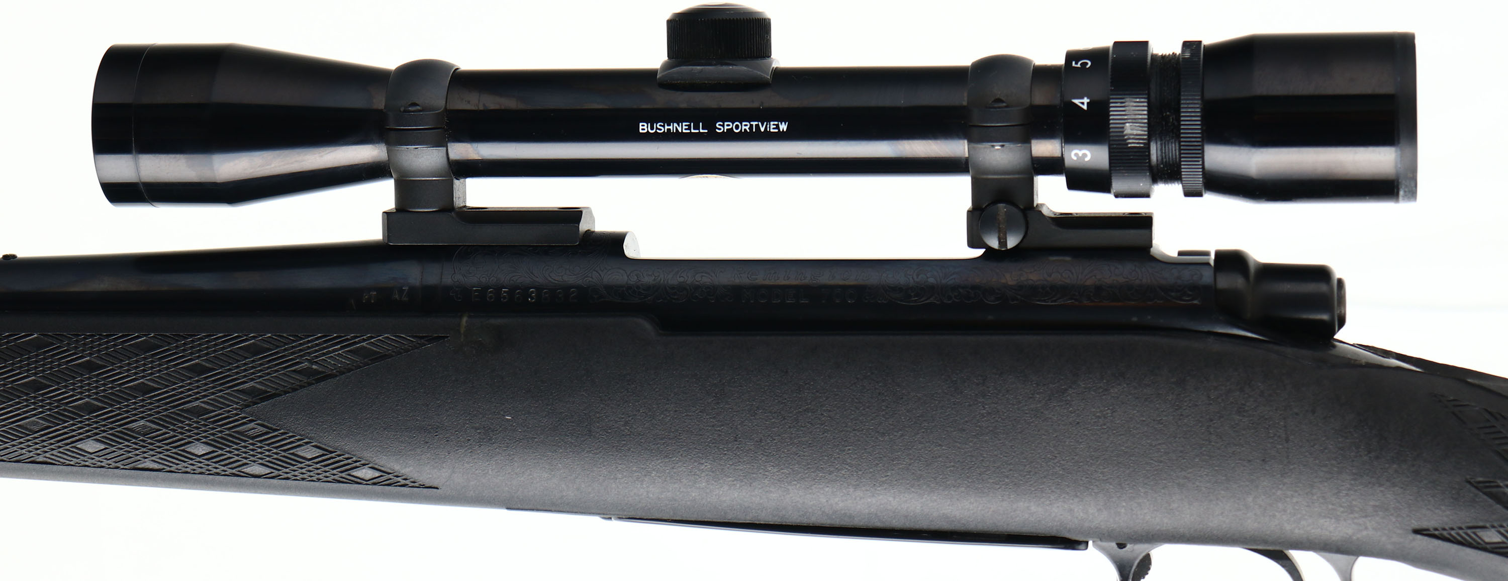 Remington Model 700, CAL: .338 Win Mag, MFG: Modern, SN: E6563832, Bolt Action Rifle, 24'' barrel. The rifle has been updated with a Ram-line checkered & capped pistol grip black synthetic stock, which is excellent. The receiver & floorplate display machine scroll engraving, with the bust of a Ram also on the floorplate. The original metal blue finish rates 95% overall. The bore is excellent. The receiver holds a Bushnell Sportview 3x-9x scope, while the original sights have been removed & the original holes screw filled. Sling studs. Jeweled bolt. Stock carries a solid recoil pad. A quality all weather hunting rifle. FFL Req. - Value: 400 to 800