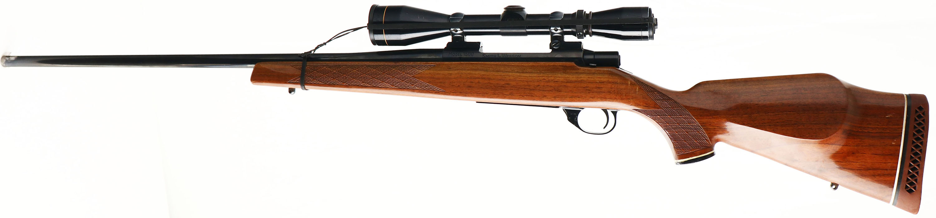S&W, Model 1500, CAL: 7MM REM MAG, MFG: 1982-84, SN: PN15776, Bolt Action Rifle, 24'' Tapered steel barrel. Smith & Wesson, one of the largest handgun companies in the world, no longer makes a rifle. In 1984, the company discontinued production on all long guns, including the Model 1500 rifle. Rifles & shotguns were made for S&W by Howa Machinery, Ltd., Japan. This model's production run lasted for only two years & it has now become a collector's item. The original skip-line checkered, cheeked & capped pistol grip walnut stock is excellent. There are a half dozen minor scuffs scraps or scratches to the original finish. Some minor finish chipping around pistol grip cap. The metal blue finish rates 97% overall, with the majority of wear located at the muzzle end of the barrel. Bore is excellent. The receiver carries a Leupold Vari-XII 3X9 scope on Redfield blocks, with no provision for open sights on the barrel. Stock carries the factory S&W marked ventilated recoil pad. Whiteline spacers on buttpad & pistol grip cap. Sling studs. Jeweled bolt. A quality deer hunting rifle. FFL Req. - Value: 800 to 1500