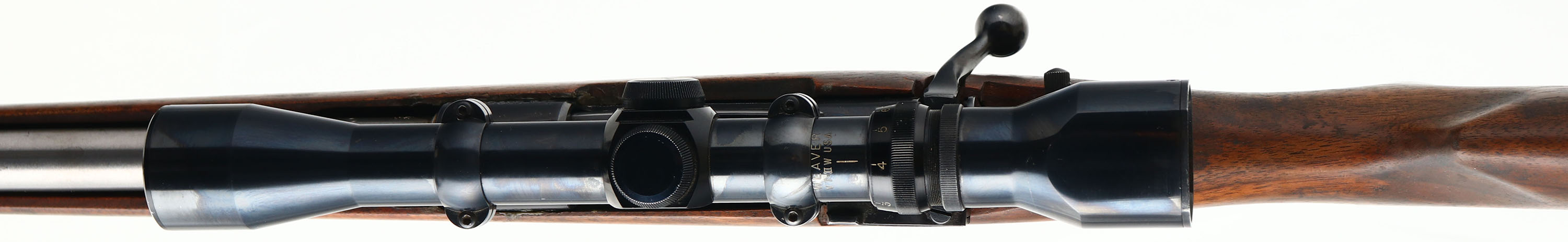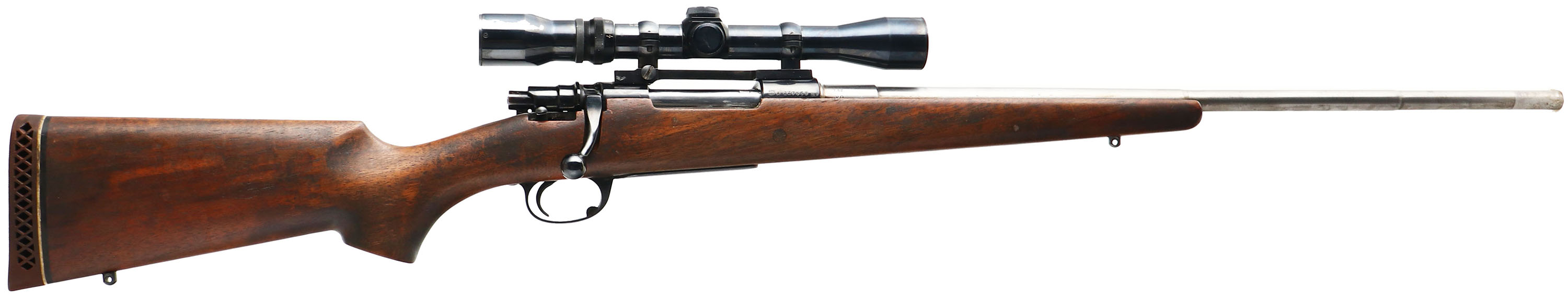 CUSTOM Interarms (Mauser Action) Model Mark X Custom Sporting Rifle, CAL: 30-06 Ackley Improved, MFG: Modern, SN: A227568, Bolt Action Rifle, 24'' Stepdown barrel. The .30-06 Ackley Improved is a wildcat cartridge formed by firing a .30-06 Springfield cartridge in a rifle that has been chambered or re-chambered for the ''improved'' version. Upon firing, the case ''blows out'' to conform to the new, enlarged chamber. The new dimension has a reduced body taper & increased shoulder angle compared to the original .30-06 Springfield case. By doing so, the volume is increased a small amount, less than five percent. You cannot get the fatter case of a .30-06 Ackley Improved into a standard .30-06 Springfield rifle chamber, but the reverse is obviously true. The flat pistol grip walnut stock on this rifle is very good & solid. There are several small handling blemishes & some chipping behind the upper tang, to the flat finished hand oiled stock. The stock has some soiling & darker staining. The barrel is left in the white (not blued), while the metal blue finish on the receiver, floor plate & trigger guard rates 80% overall. Bore is excellent & bright. The receiver carries a Weaver Micro-Trac V7-II W USA 2.5x7 scope, with no open sights on barrel. Buttstock carries a ventilated recoil pad. Sling studs. A solid custom built sporting rifle in a unique caliber. FFL Req. - Value: 300 to 600
