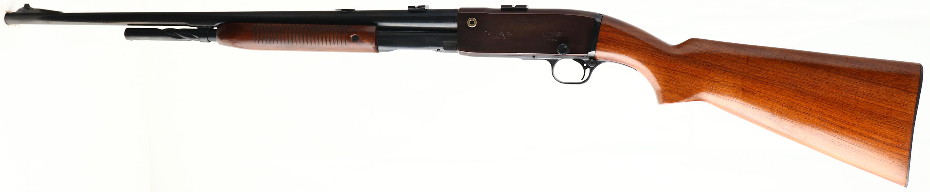 Remington, Model 141 Gamemaster, .30 REM Cal., MFG. 1938, SN: 16682, Pump Auction Rifle, 24'' round barrel, The original flat pistol grip wood stocks are excellent & solid, with the stock having been very nicely refinished, forend finish original. Stocks show very few light handling marks. The metal blue has been refinished, rating 95% on the barrel, with some speckling, while the receiver finish has toned plum with a spotty haze. Bore is excellent. Mounted with two scope blocks on the receiver & barrel, with an extra screw filled hole behind the block on the barrel. The rear dovetail filled with a blank & standard front ramp sight. Checkered metal buttplate. Action is tight & functions well. FFL or C&R Req. - Value: 300 to 600