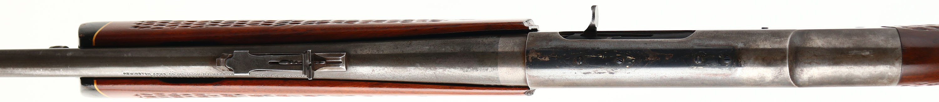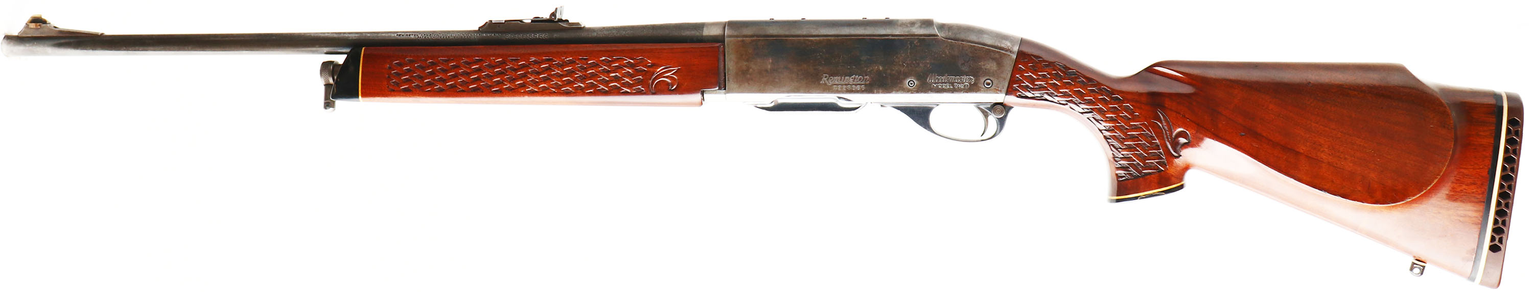 Remington, Model 742 Woodsmaster, 30-06 SPRG. Cal., MFG. 1972, SN: 7226365, Semi-Auto Rifle, 22'' round barrel, The factory basket weave checkered & capped pistol grip wood stocks are very good, solid & original. They carry several minor scuffs, handling marks & contusions to the factory finish. The factory metal blue finish has worn off to mostly a gun metal gray, with a thin layer of brown patina & some remains of original blue. Ramp adjusting rear sight & ramped brass blade front sight. Receiver has been factory tapped for potential scope mounting, a scope was previously mounted. Bore is excellent. Stock carries a White Line ventilated kickpad. 13 1/4'' LOP over pad. Sling swivel provisions. A popular caliber semi-auto hunting rifle. FFL or C&R Req. - Value: 250 to 450