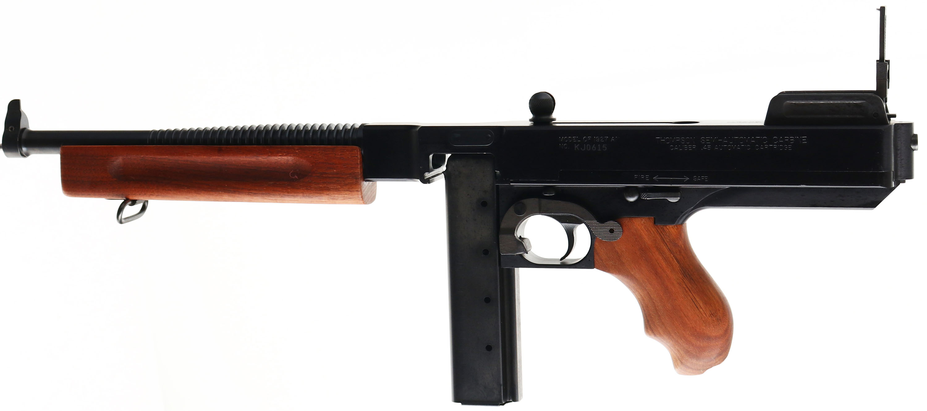 CASED & NEW Thompson Auto Ordnance Corporation, (Kahr Arms), Thompson 1927A-1 pistol, MFG: 2016, SN's: KJ0615, Semi Auto Pistol, 10.5'' barrel. This was produced in 2016 at the same time they produced the 100 Year Anniversary 1916-2016 of the Thompson Auto Ordnance Corporation sets. Auto-Ordnance was a U.S. arms development firm founded by retired Colonel John T. Thompson of the United States Army Ordnance Department in 1916. Auto-Ordnance is best known for the Thompson submachine gun, used as a military weapon by the Allied forces in World War II, & also notorious as a gangster weapon used during the Roaring Twenties. The Thompson 1927A-1 pistol (Tommy Gun) carries deluxe American walnut vertical foregrip, pistol grip & forend which are mint, displaying beautiful wood grain & factory finish. The factory metal blue finishes are 99%+. Features include a pinned in front blade & a folding ladder rear adjustable sight. Bore is mint. Has the stick mag. The gun come stored in a polymer hard case with the yellow Thompson Bullet logo & the words ''Chicago Typewriter'' in white stamped on the black case cover. Factory owner's manuals, booklets & lock are included in case. Frank Harris, VP of Sales & Marketing, Kahr Firearms Group wrote regarding the sets & this pistol model, ''We are proud to honor the name & the legacy of General John T. Thompson with this special 100th Anniversary matched set. There is a rich historical past attached to the Tommy Gun, & we feel General Thompson would be proud to see that what started as a research project in 1915 has served the military, law enforcement & shooting enthusiasts around the world so prominently for over 100 years.'' This is N.O.S. from a gun shop & not previously sold to the public. It is a fantastic & high quality firearm, which have risen in value & has become very collectible. MSRP is $1800. Reference lot #5860 in this auction for additional mags & mag pouches which fit this gun. FFL Req. - Value: 1000 to 1700