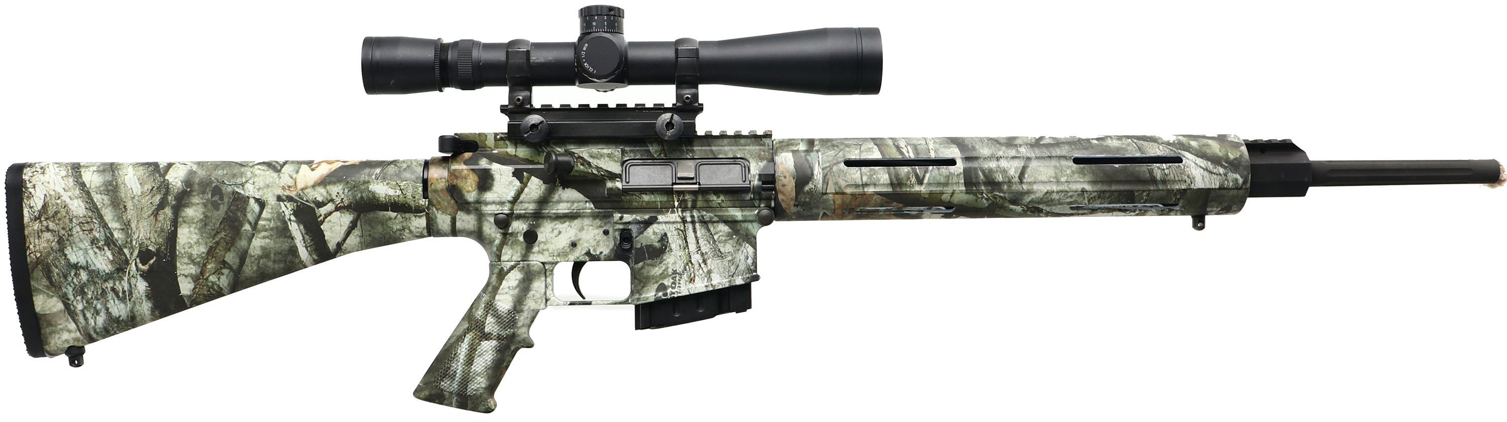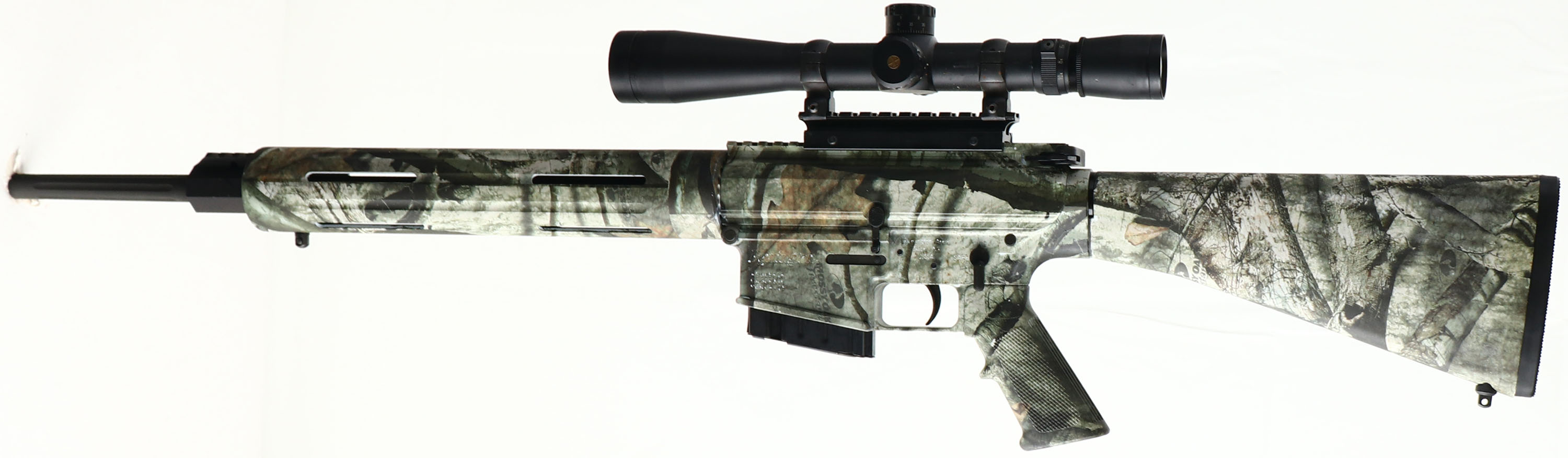 Remington, Model R-25, CAL: .308, MFG: Modern, SN: RD005808, Semi Auto Rifle, 20 3/4'' fluted barrel. The checkered plastic grip, composite stock & fluted metal forend are all excellent. The Mossy Oak TreeStand camouflage finish is excellent. Bore is excellent. The rifle is fitted with a Leupold Vari-X III 3.5-10x40mm scope. No open sights. Checkered plastic buttplate. Sling studs. DPMS 4rnd mag. From Gun Critic: ''The Remington R-25 Semi-Auto Rifle is built on the proven AR-10 platform, using the direct-impingement gas system, where gas is ported down a tube into the action to cycle the rotary bolt locking mechanism. The lack of an operating rod and piston allows the barrel to be free-floated, greatly improving inherent accuracy. Movement of the bolt carrier in-line with the bore, and the recoil spring inside the stock reduces recoil and muzzle jump considerably, allowing for rapid follow up shots at multiple targets or running game.''. FFL Req. - Value: 600 to 900