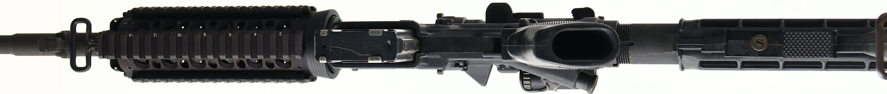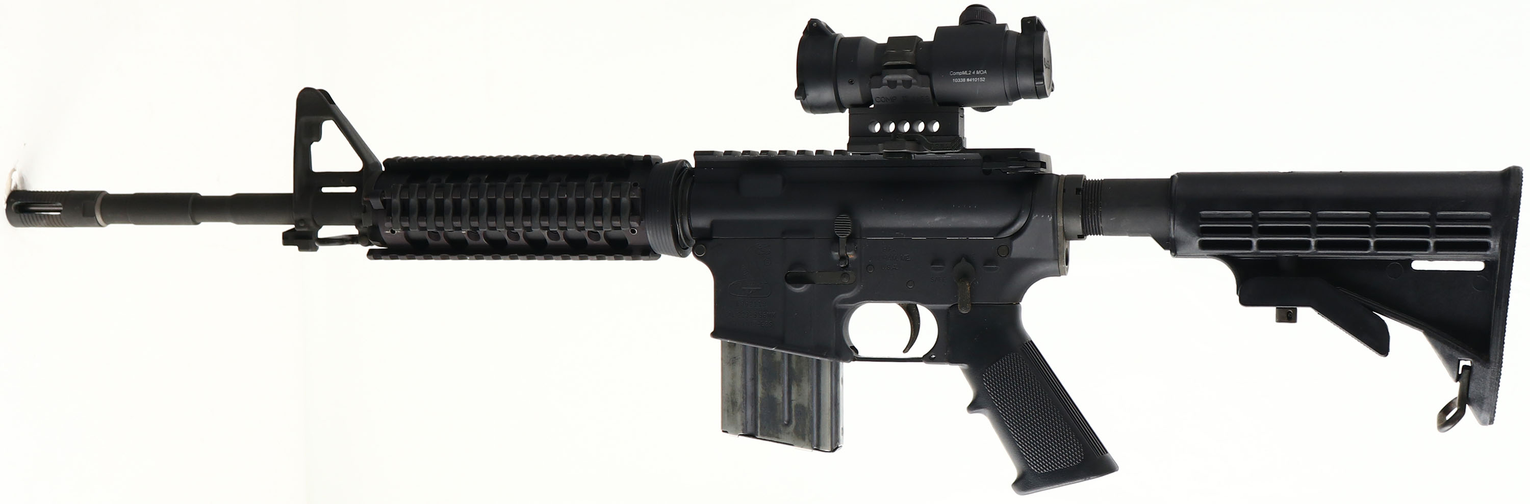 B.F.I (Bushmaster), Model XM15-E2S, CAL: .223/5.56, MFG: Modern, SN: L362118, Semi Auto Rifle, 15'' barrel 16 1/2'' with muzzle brake. The checkered synthetic grip & composite 6pt adjustable stocks are excellent, with handling marks. The matte black finish on the receiver rates 95%. The parkerized finish on the barrel is very good, with spotting/speckling. Oxidization in the muzzle brake. Bore is excellent. The rifle is fitted with a Aimpoint CompML2 4 MOA scope. Quad picatinny forend for accessories. SureFire picatinny rubber grips. Stock has a checkered plastic buttplate. Sling loops. Colt AR-15 mag. FFL Req. - Value: 400 to 800