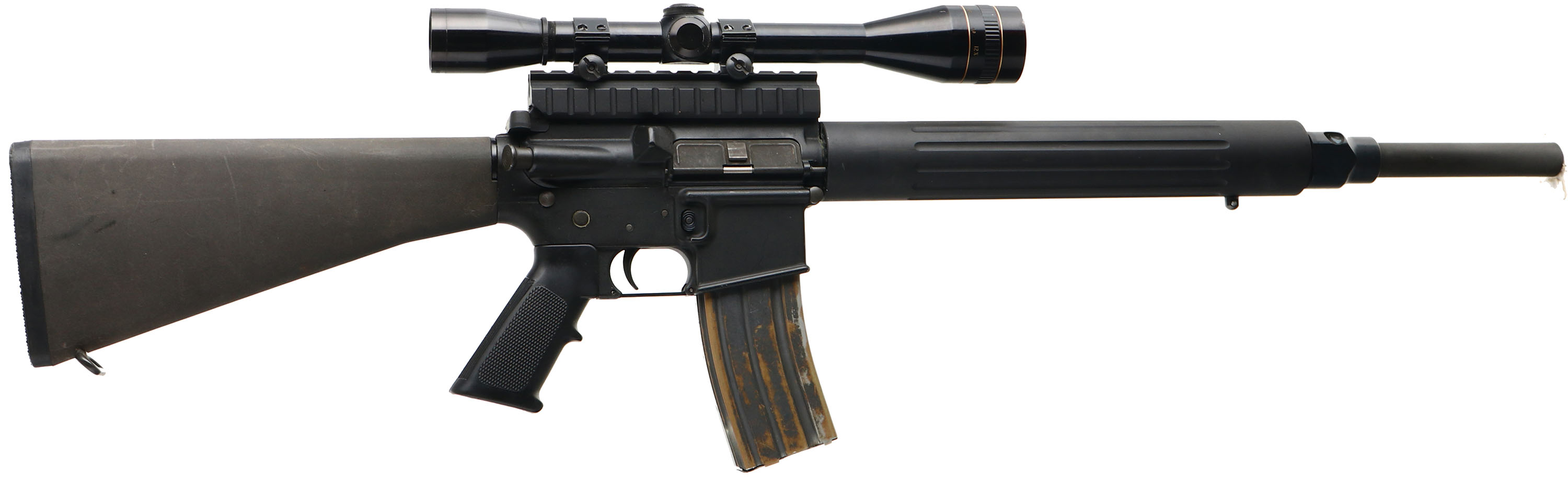 DPMS, AR-15, CAL: .223/5.56 (barrel marked .223), MFG: Modern, SN: 11117, Semi Auto Rifle, 20'' barrel. The synthetic checkered grip, composite stock & fluted metal forend are all excellent, with handling marks & scuffs. The matte black finish on the upper, lower & barrel rates 95%. The finish on the receiver has a grainy texture & the metal blue finish on the barrel is smooth. Bore is excellent. The rifle is fitted with a Leupold Gold Ring 12x scope. No open sights. Sling loop & stud. Magazine is worn, with brown patina. FFL Req. - Value: 400 to 700