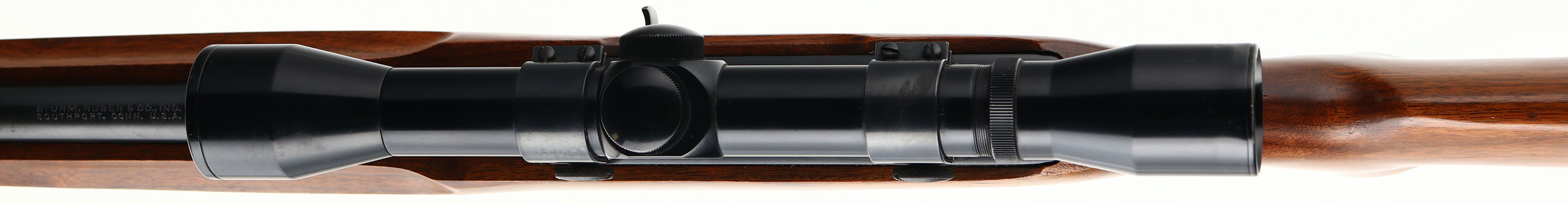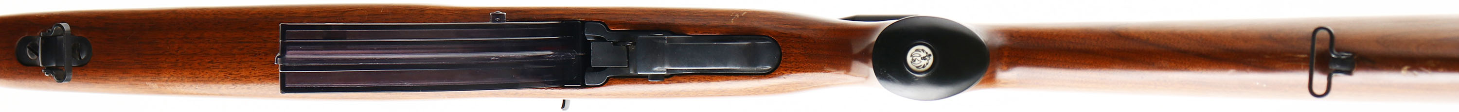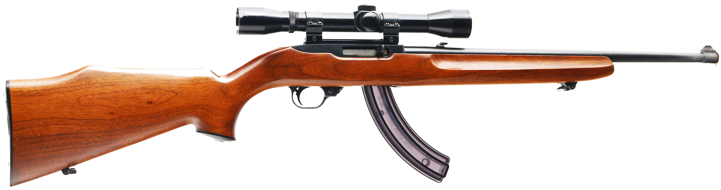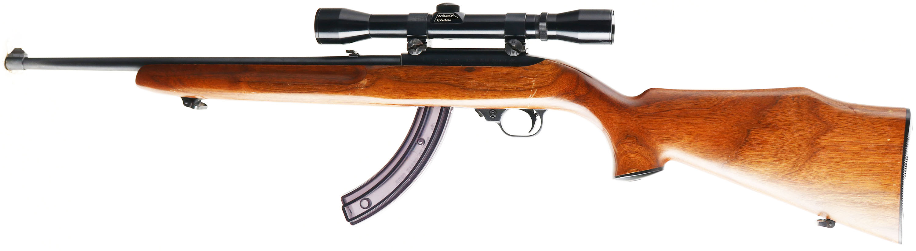 Ruger, Model 10/22, CAL: .22 LR, MFG: 1968, SN: 120075, Semi Auto Rifle, 18.5'' barrel. Early 5th year of production example. The original capped pistol grip Monte Carlo & finger groove walnut stock is excellent, with a number of minor handling mark or scuffs to the original finish. The original metal blue finish on the barrel is 98%, while the matte black finish on the receiver rates 98%. Bore is excellent. The receiver is mounted with a Bushnell 4X Banner scope, while the barrel holds a folding leaf rear & blade front sights. Stock carries a smooth plastic buttplate. Sling loops. Butler Creek Corp. extended mag. FFL Req. - Value: 200 to 400