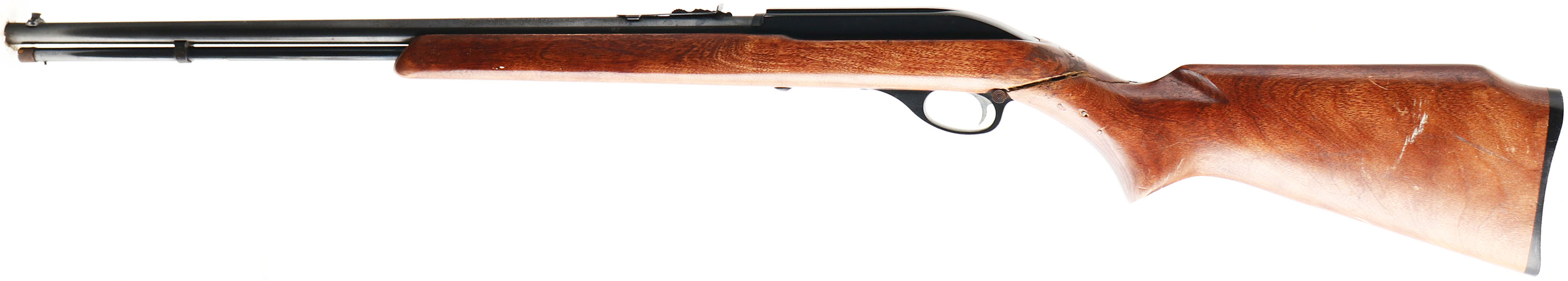 Western Auto Supply Co. Revelation (Marlin Glenfield 99), Model 120, CAL: 22 LR, MFG: 1960's, SN: none, Semi Auto Rifle, 22'' barrel. Full 17 rd mag. The original flat pistol grip Monte Carlo stock is poor, as a result of a full break & poorly glued repair at the wrist of the pistol grip. It also has 7 added pegs in the area of repair to add structure. Despite the break & gap at the repair, the stock is fairly solid, with lots of other finish level scratches & scrapes to the original finish. The original metal blue finishes rate 80%. Bore is excellent. The barrel holds a standard adjustable rear sight & small blade front sight. Stock carries a checkered plastic buttplate. FFL or C&R Req. - Value: 50 to 150