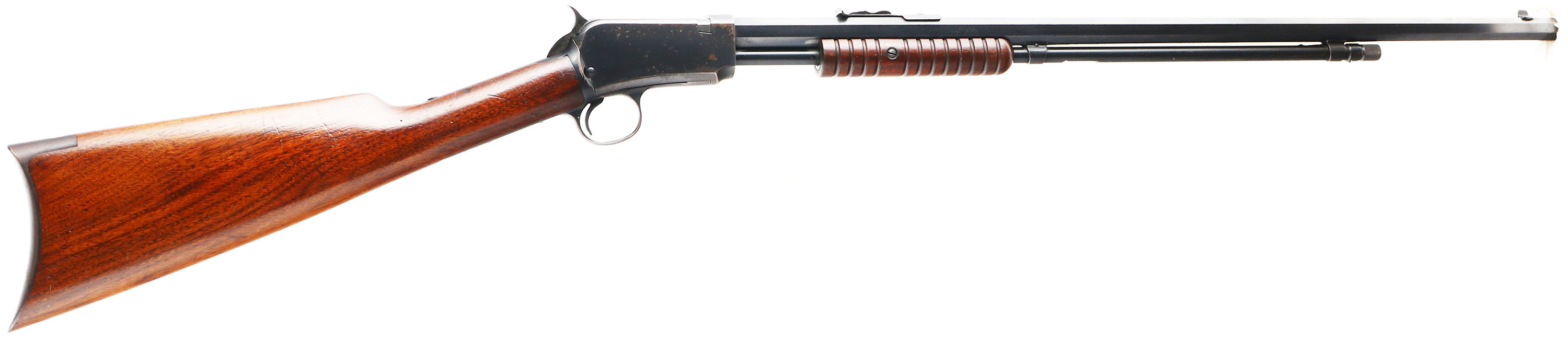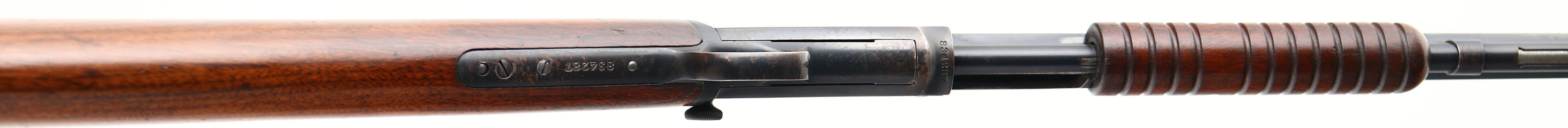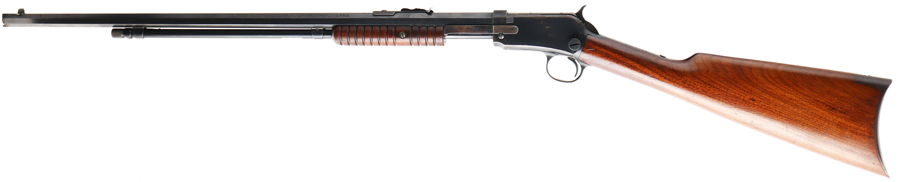 Winchester, Model 90, 3rd variation, .22 L. Rifle, Cal., MFG. 1930, SN: 834287, Pump Action Rifle, 24'' Octagon barrel. Desirable single caliber designation. The original straight grip wood stocks are excellent, with the original finish & an extra thin layer of protective finish. There are several minor handling marks, scuffs & contusions. The original metal blue finish rates 98% on barrel, 90% on the receiver & 95% on the mag tube. The rifle is fitted with an adjustable rear & small blade front sights. Bore is excellent. Crescent metal buttplate. Smooth tight action. Collectible as an original single caliber 90 rifle.* FFL or C&R Req. - Value: 2000 to 3000