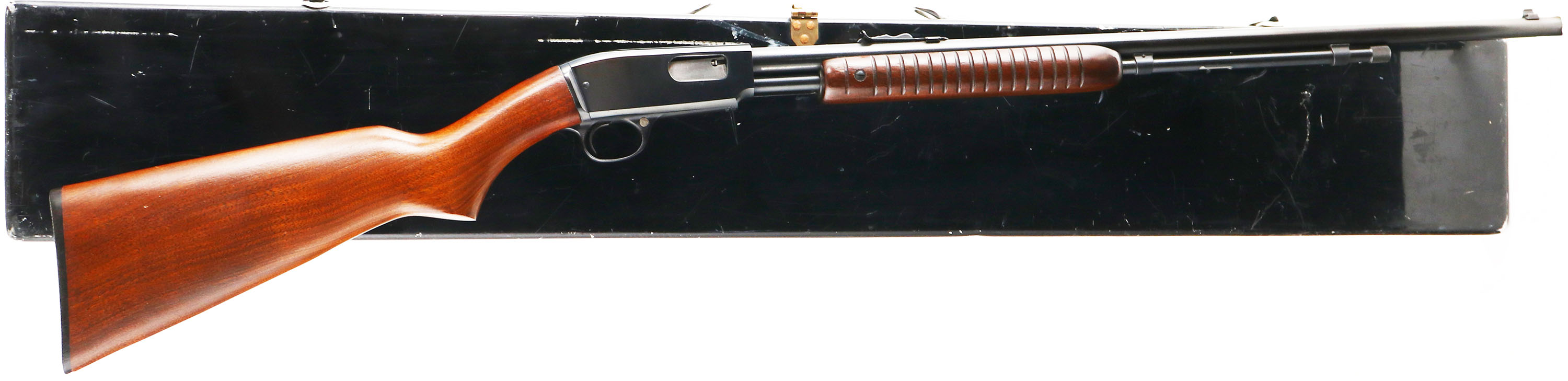 CASED Winchester, Model 61, CAL: .22 S.L.LR., MFG: 1961, SN: 286886, Pump Action Rifle, 24'' Round barrel. Grooved receiver. The original flat pistol grip wood stock & grooved forend are excellent, having very few tiny handling marks or scuffs to the finish. The original metal finish rates 99% overall. Bore is excellent. The barrel holds an adjustable rear sight & small blade front sight. Buttstock carries a plastic Winchester logo buttplate. Comes in a very nice, period, metal, full length case. Case has cutouts for a cleaning rod & boxes of ammo, which are not included. Case has some scuffs & scratches & is missing the handle. An excellent collectible rifle & cool with the period fitted case.* FFL or C&R Req. - Value: 1500 to 2500