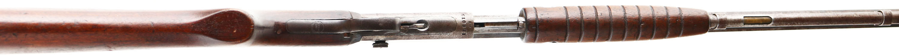 Remington, Model 12C, .22 S. L. & LR., MFG. 1909-36, SN:510383, Pump Rifle, Take-down, 24'' Octagon barrel. The straight grip wood stocks are very good & solid, however the original finish is worn thin & has darkened from use & added oils. There are numerous minor scuffs, scratches or contusions, along with a 1'' crack on the right side of the forend. The original metal blue finish has worn gun metal gray, with a spotty brown patina & pitting. Barrel carries replacement adjustable rear & small blade front sights. Bore is poor, with lots of pitting & scarring amongst worn rifling. Original crescent metal buttplate. A candidate for restoration. FFL or C&R Req. - Value: 150 to 300