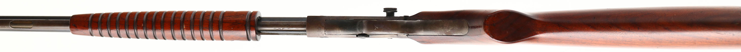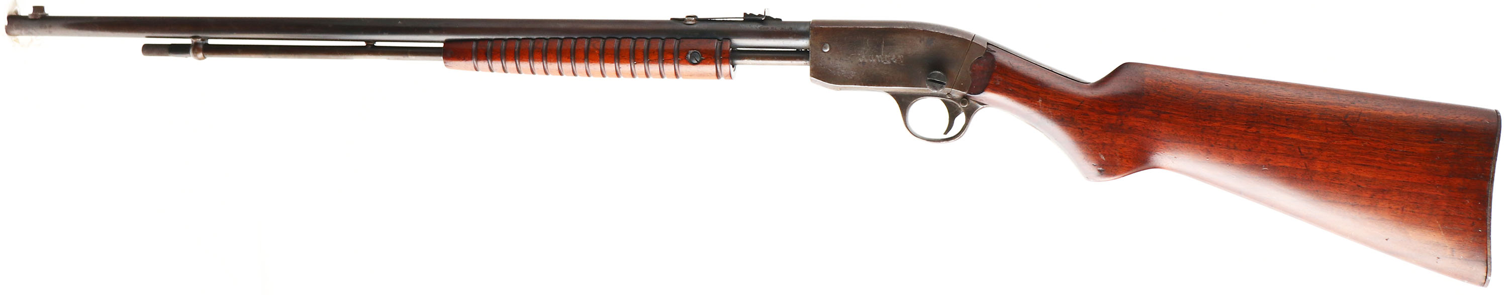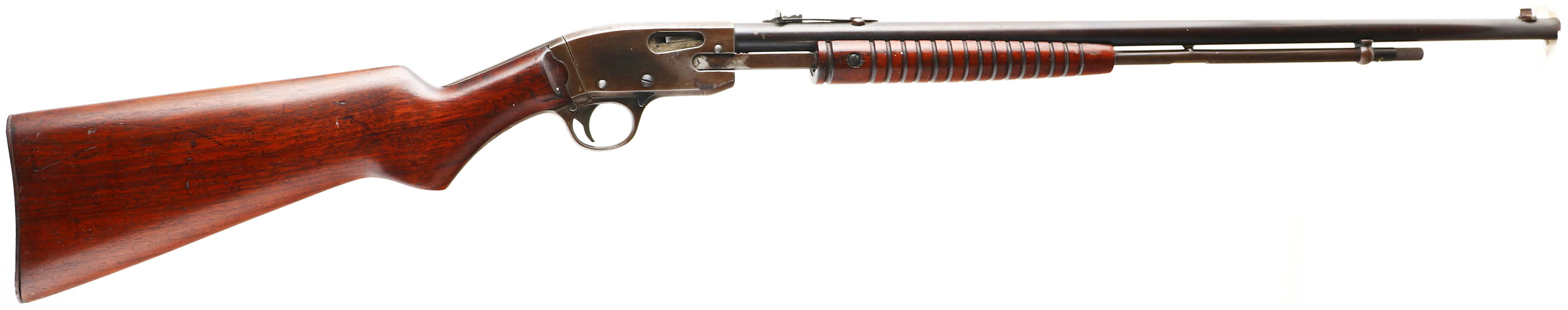 Ranger (Savage), Model Pump Action (29A or 29B), .22 S.L.LR., MFG. 1950's, SN:148789, Pump Rifle, 24'' Round barrel. The flat pistol grip wood stocks are very good & solid, with numerous minor scratches, nick & contusions to the finish. The original metal blue finish on the barrel is starting to tone a bit plum gray/brown, with coverage remaining at 50% & lots of spotty areas of rust pitting. The receiver & mag have 30% coverage of a brown patina, with spotty rust pitting. Barrel carries standard front & adjustable rear sights. Bore is fair, with pitting & scarring to thin rifling. Lots of Rust pitting on metal buttplate. FFL or C&R Req. - Value: 150 to 300