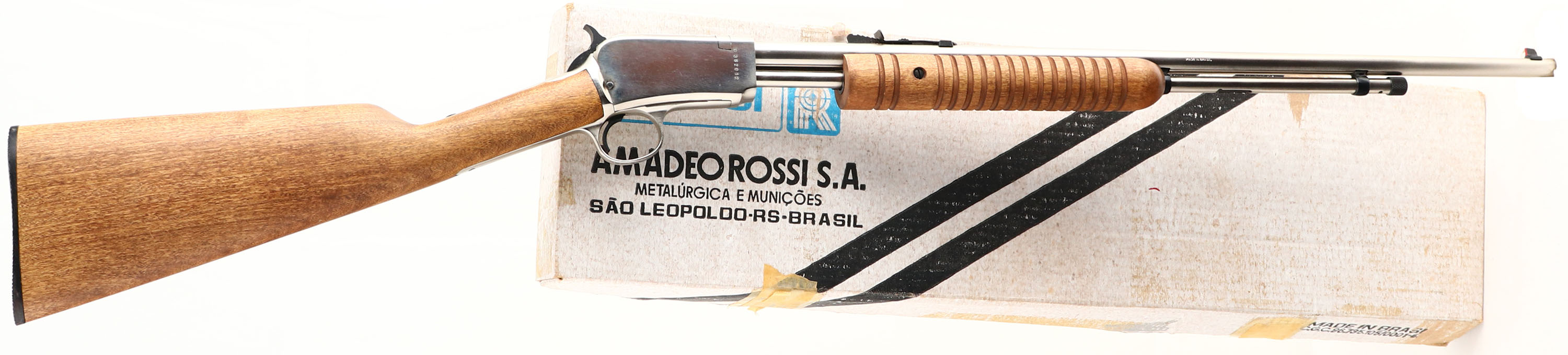 BOXED Rossi Model 37, marked .22 S.L. LR., MFG: 1980's, SN: G382012, Pump Action Rifle, 23'' round barrel. This is a Rossi reproduction or copy of the Winchester 62. The original blond straight grip wood stocks are excellent & carry the original excellent finish, with no wear. The original matte stainless finish on the barrel & tube, & polished stainless on receiver all rate 100%. Bore is new. Barrel has factory sights. Buttplate is original. Comes in the correct factory box, with owner's manual & packaging. An excellent, original & fairly rare little pump rifle. FFL Req. - Value: 300 to 500