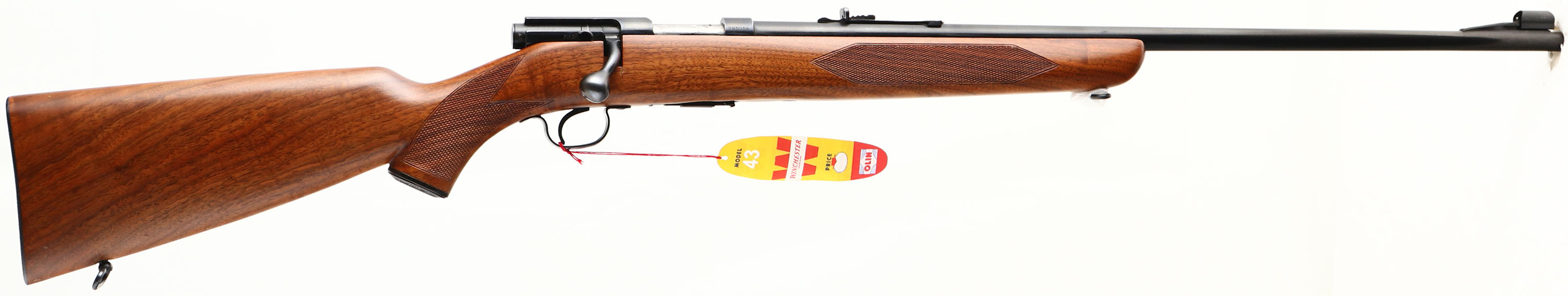 RARE Winchester, Model 43 ''Special Model'', CAL: 22 Hornet, MFG: 1950, SN: 28595A, Bolt Action Rifle, 24 1/2'' barrel. The original deluxe checkered & capped pistol grip wood stock is excellent, with a couple of minor handling marks & dings. Excellent original finish. The factory metal blue finish rates 99% overall. Bore is excellent, with sharp rifling. The barrel holds an adjustable rear sight & ramped hooded front sight. Buttstock carries a checkered metal buttplate. Factory sling loops. Comes with the factory mag marked ''MODEL 43 22 HORNET'' & a repro hang tag. During the 5 years of production, 1948 to 53, less than 63,000 model 43 rifles were produced. Of those, very few were deluxe ''Special Models''. Collector's typically add 100% to value for the deluxe ''Special Models''. A high condition deluxe rifle that's very collectible & desirable.* FFL or C&R Req. - Value: 4000 to 5500
