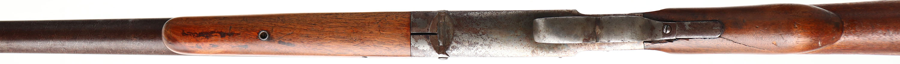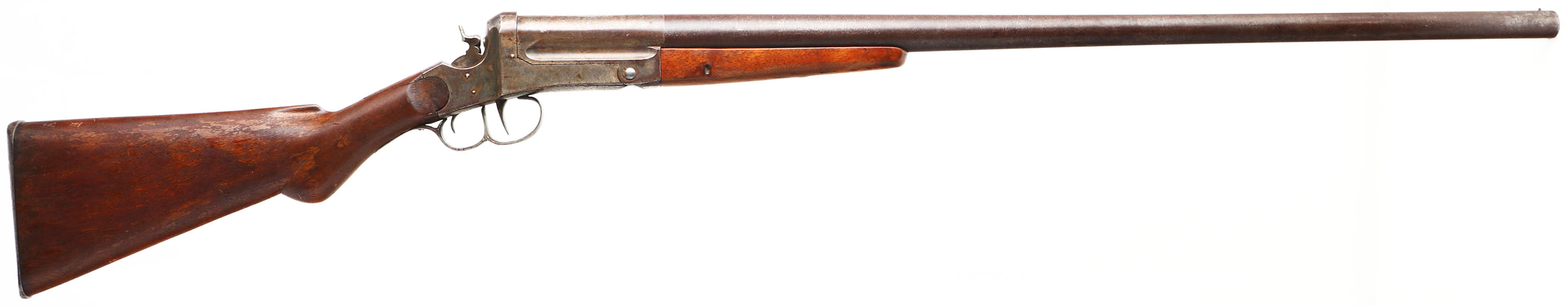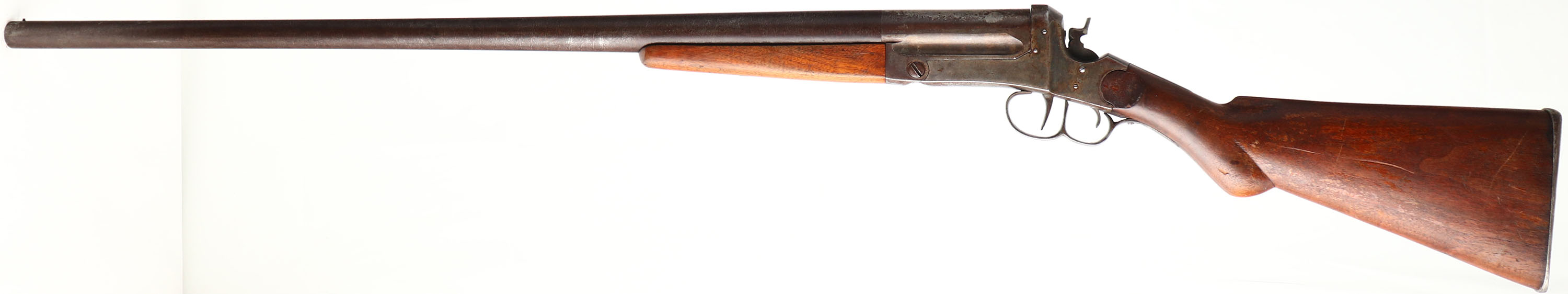 C.S Shattuck, Model ''American'', CAL: 8GA, MFG: 1880-1908, SN: 633, Break Action Single Shot Shotgun, 36 1/4'' barrel. The round knob stock & forend are very good, as the stock appears original & the forend a later replacement that has been with the gun for a long time. There are several minor contusions & surface scrapes to the finishes, which also show thinning & flaking. The London Twist barrel has fully toned to a beautiful chocolate brown patina. The frame & receiver end of the barrel are case-hardened, retaining visible, but faded case-colors, with intermittent spotting of a brown patina. Bore is very good. The barrel holds a single front bead. The front trigger breaks the barrel & the rear trigger fires the gun. Stock carries a smooth metal buttplate. A nice example of a turn-of-the-century large bore shotgun. Notice: London Twist barrels are not safe to shoot smokeless powder or steel shot. FFL or C&R Req. - Value: 1000 to 2000