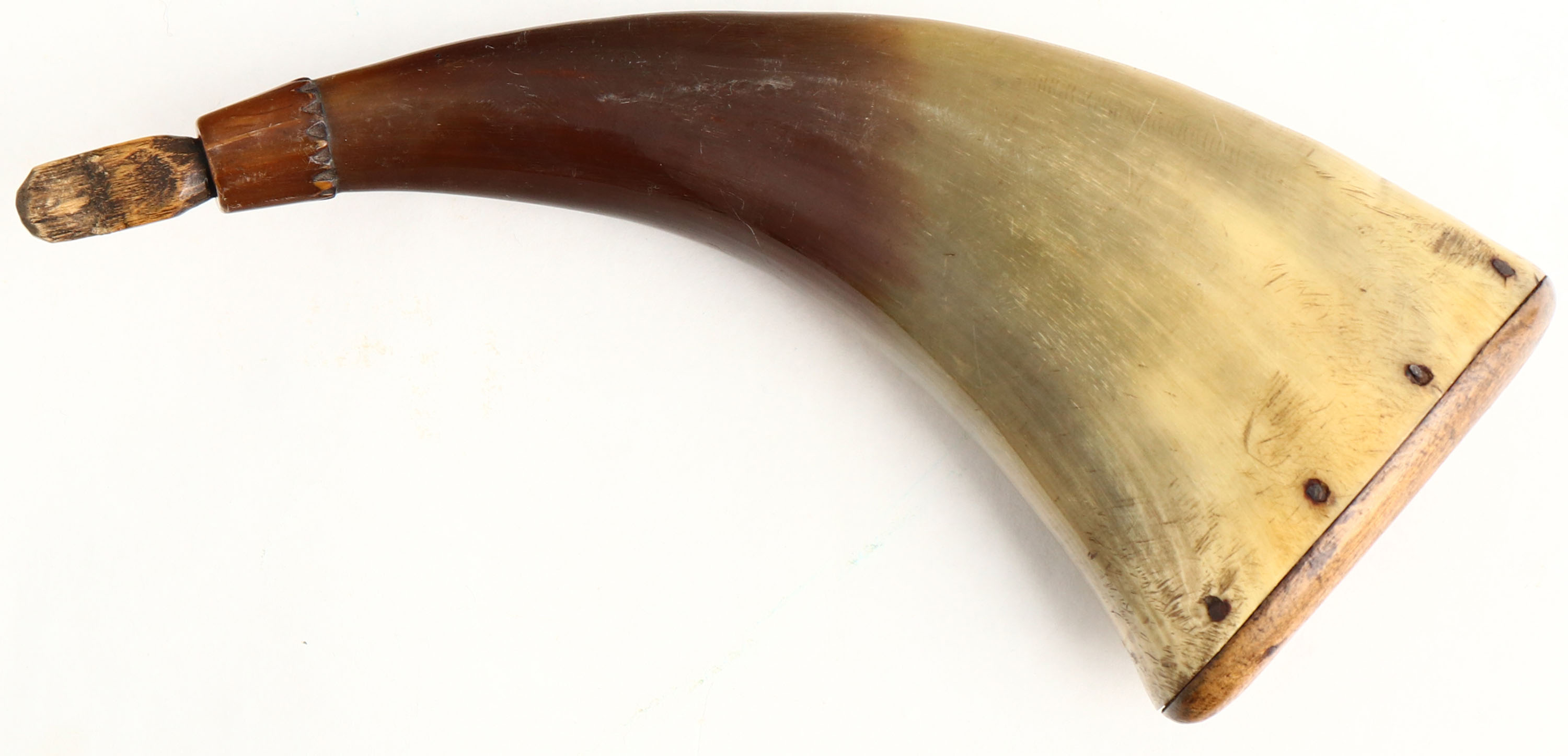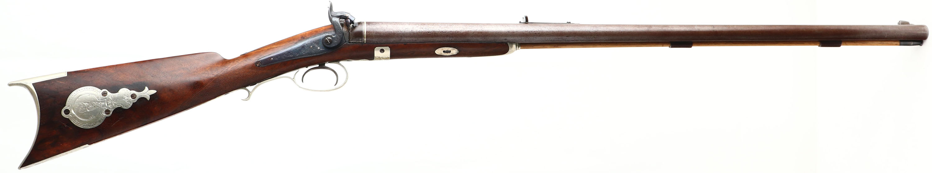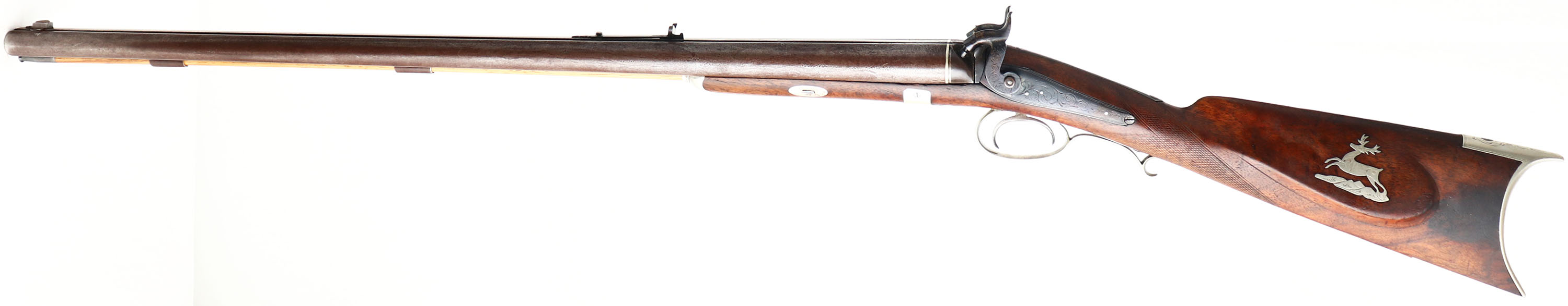 Unknown Mfg, Combo Gun, CAL: 12GA/45cal, MFG: N/A, SN: NVSN, Percussion Muzzleloader Double Barrel Combo Gun, 31 1/4'' barrels. There are no markings on this gun to give any further information. The checkered & beaded cheek straight grip wood stock is excellent. The beaded cheek has a silver inlaid deer & mountain background & the right side of the stock has an engraved trap door compartment for patches. The silver furniture, receiver & hammers all display hand engraved floral/ornamental scroll. The barrels have worn to a mix of metal gray, evenly toned to a brown patina. The chamber end of the barrels have a silver band. The receiver & hammers are blued, rating 90%. The rifled bore is very good, with strong rifling. The shotgun bore is very good, appears grainy. The solid rib holds an adjustable rear sight & a block elevated blade front sight. Stock has a silver crescent metal buttplate. Comes with an authentic horn powder flask. Although we cannot give credit where it is due, the maker of this firearm was a true craftsman and their workmanship lives on. Blackpowder, No FFL Req. - Value: 500 to 2000