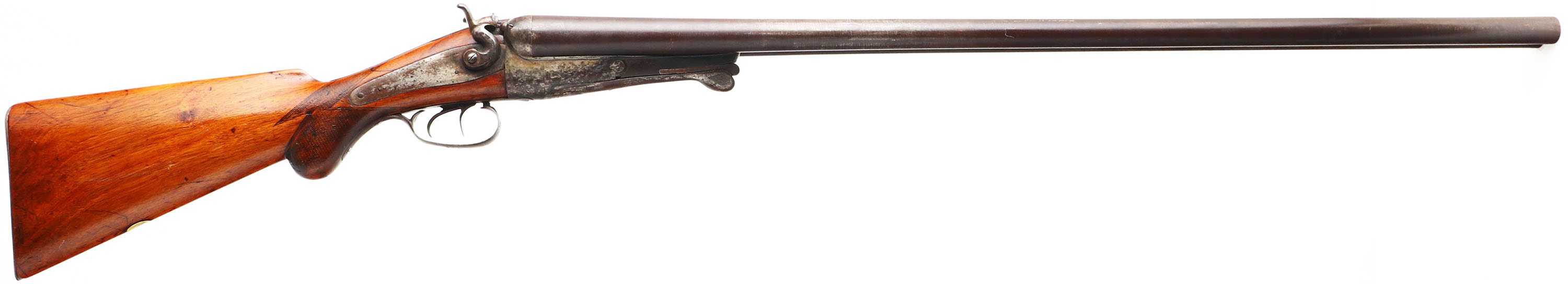 W. & H. Hudson, Underlever Shotgun, CAL: 8 GA, MFG: 1890's, in business 1893-1900's, SN: 3486, Underlever Break Action Shotgun, 35 7/8'' Belgian Fine Laminated Steel barrels. W. & H. Hudson was a Belgian gun manufacturer, who sold these shotguns to various American importers & hardware companies. The original, checkered round knob stock is very good. The stock has been sanded & carries a thick refinish. There is an edge chip at the toe, alongside contusions, scratches & scrapes. The belly of the stock carries a blank initial plate. The laminated steel barrels have toned to a brown patina. The receiver & sideplates have worn mostly gun metal gray, with spotty brown patina. The solid rib is stamped ''Belgian Fine Laminated Steel''. Bores are very good, with intermittent roughness & striations, but could be cleaned & polished. The solid rib holds a single bead. Stock carries a smooth metal widow's peak buttplate. Notice: Twisted barrels are not safe to shoot smokeless powder or steel shot out of. LOP: 13 5/8''. Antique, No FFL Req. - Value: 1000 to 2500
