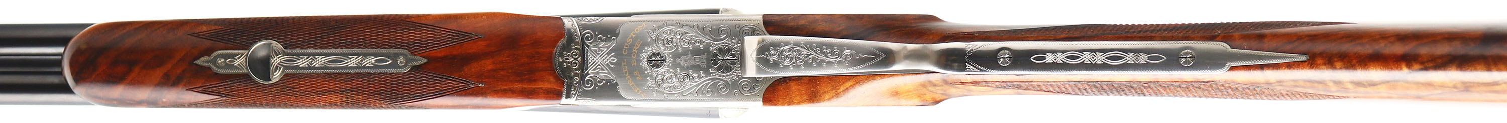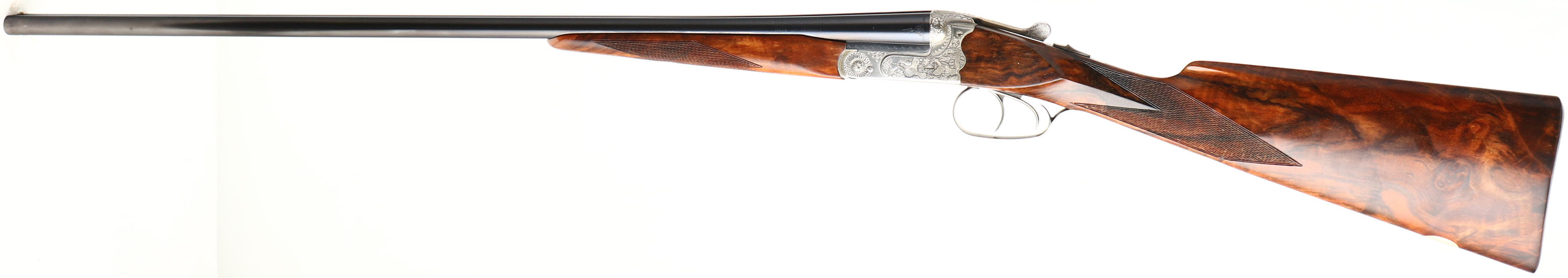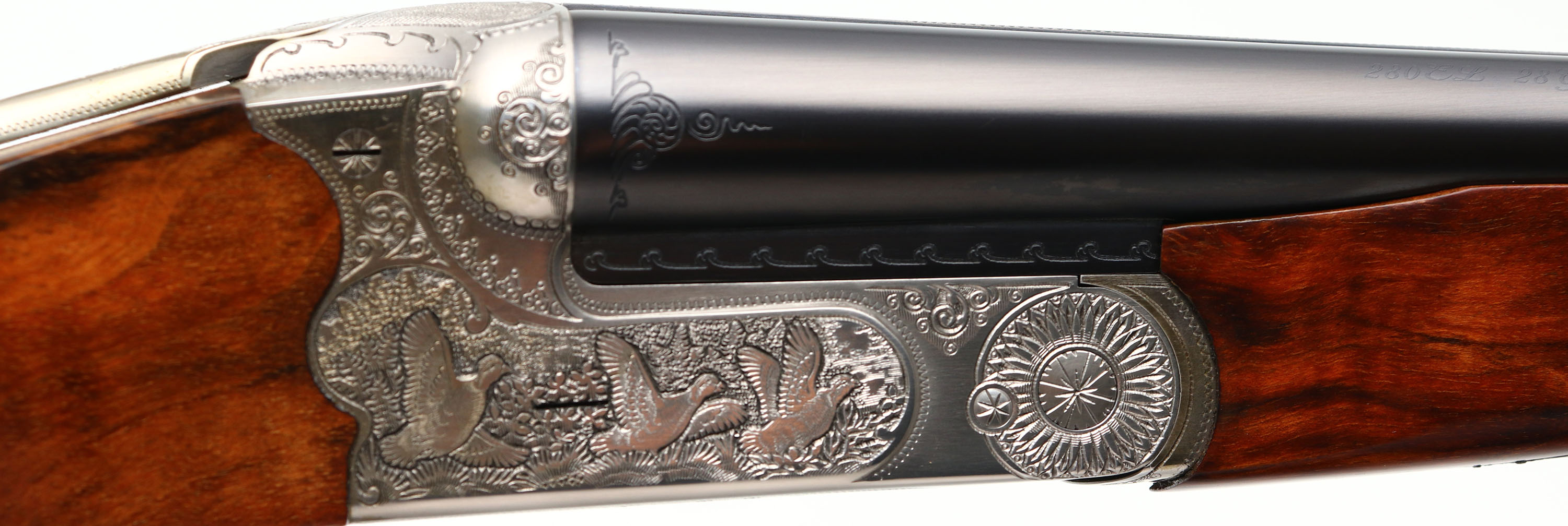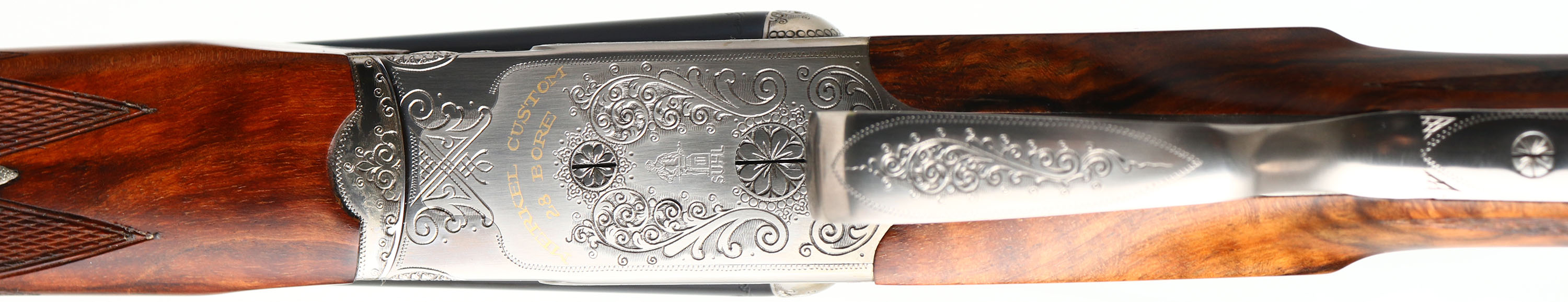 FABULOUS & BOXED, Merkel, Model 280 EL ( DF Model 41E), CAL: 28 GA, MFG: 1975, SN: 387100, Break Action SxS Shotgun, 28'' barrels. The left barrel is marked in three lines ''MERKEL USA INC TRUSSVILLE, AL.'', ''GEBR. MERKEL SUHL'', ''MADE IN GERMANY''. The right barrel is marked ''280 EL'' & ''28 GA''. The bottom of the receiver is marked in gold lettering ''MERKEL CUSTOM'', & ''28 BORE'', over the Suhl trademark logo. The top of the break lever is marked ''EL'', also in gold lettering. ''FP'' engraver initials on lower left corner of receiver. The original checkered straight grip wood stock is excellent. The grain pattern & wood figure is noteworthy & attractive. There is a blank gold oval nameplate on the belly. The metal blue finish on the barrels rates 99% overall. The polished coin silver receiver, trigger guard & break lever are all excellent. The receiver displays bird game scenes on both sides, accompanied by intricate ornamental scroll work on the break lever, trigger guard, forend metal components, screws & barrel rib end. Bores are excellent, with a few visible striations. The solid, matted rib holds a single gold tone bead. Checkered butt. Comes with factory SN matching box, with original packaging. Box condition is excellent. FFL Req. - Value: 6000 to 10000