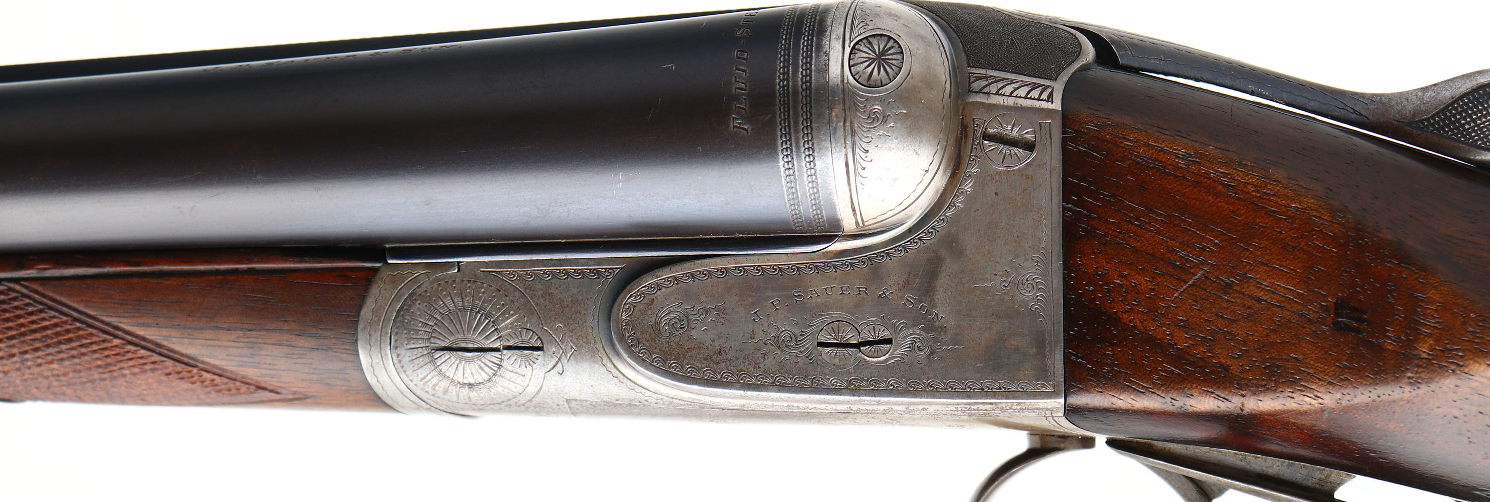 J.P Sauer & Son, Hammerless Shotgun, CAL: 12 GA, MFG: 1906, SN: 117065, Break Action SxS Shotgun, 28'' barrel. Both barrels are marked ''J.P SAUER & SON'' & ''KRUPP ESSEN'' near the chamber. Both sides of the receiver are marked ''J.P. SAUER & SON'', over the screws. Matching SN's can be found on the lower tang, floor plate, left barrel & a partial matching SN is on the forend. Floor plate & left barrel are marked ''MADE IN PRUSSIA''. The checkered flat pistol grip stocks are very good, having been lightly sanded & refinished. There are smoothed contusions, nicks & dings. The forend has a small edge chip repair at the tip. The checkering has been retraced & is sharp. There is an inlaid blank oval silver nameplate on the belly of the stock. The original metal blue finish on the barrels rates 85%, with areas wearing thin, toned to a thin brown patina. The case-hardened receiver has mostly worn to a mix of metal gray & brown patina, with remnants of case-colors in protected areas. Intricate ornamental scroll engraving on the receiver, break lever, trigger guard, forend metal components, screws & barrel rib end. Bores are excellent. The solid matted rib holds a single front bead. Stock has a Decelerator solid black rubber recoil pad. A partially restored quality German shotgun from the early 1900's. FFL or C&R Req. - Value: 1500 to 3000