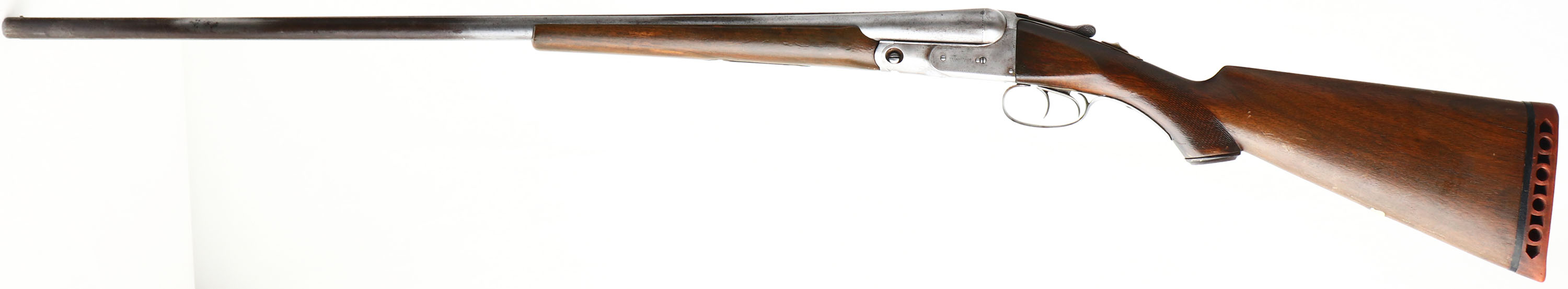 Parker Bros, VH Grade, CAL: 16 GA, MFG: 1910, SN:154917, Break Action SxS Shotgun, 32'' barrels. Extractor, Full/Mod, 1 1/2 Frame, The checkered, capped pistol grip stock & beavertail forend are very good, having been sanded & refinished. There are minor contusions & scrapes, with a few minor cracks; one next to the receiver, one next to the trigger guard, one at the comb & one on the left side of the stock. There is filler where the widows peak part of the buttplate was. The metal finish on the barrels has worn to a mix of metal gray & brown patina, with remnants of blue in the barrel creases. The receiver has worn to mostly metal gray, with spotting toned to brown patina. Bores are excellent. The solid, matted rib holds a single front bead. Stock has a Ranger, ventilated red rubber recoil pad. FFL or C&R Req. - Value: 300 to 600